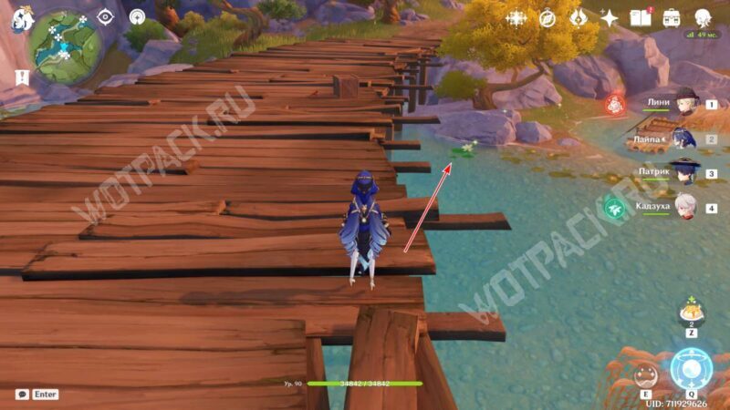 Сначала переместитесь к подземелью «Чистая вода и горная пещера». Подойдите к краю обрыва и сразу увидите блеск трёх цветущих лотосов.