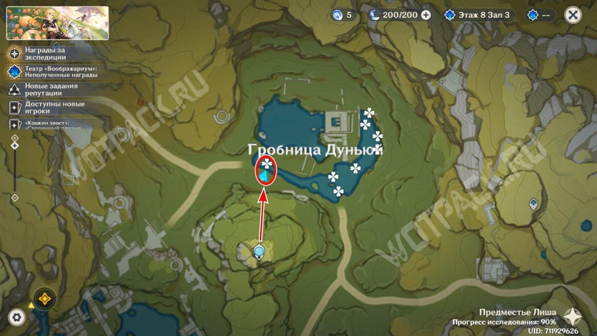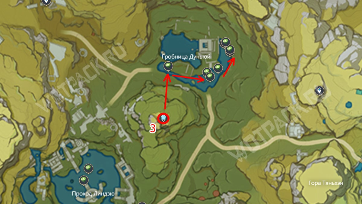 Потом переместитесь к статуи Гео Архонта «Гробница Дуньюй». Слетите на север пригорка, к небольшой заводи, где растет один лотос.