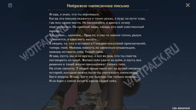 Человек, который отбросил прошлое — личная история охотницы Ягоды, связанной с преступным миром. Небольшое поручение из гильдии в Genshin Impact заставит встретиться со знакомыми героини, которые не смогли встать на верный путь и отказаться от краж. В лагере на Звёздной отмели каждый из бандитов обречен на существование в вечных поисках моры и ресурсов для того, чтобы прожить хотя бы ещё один день.