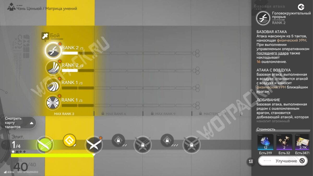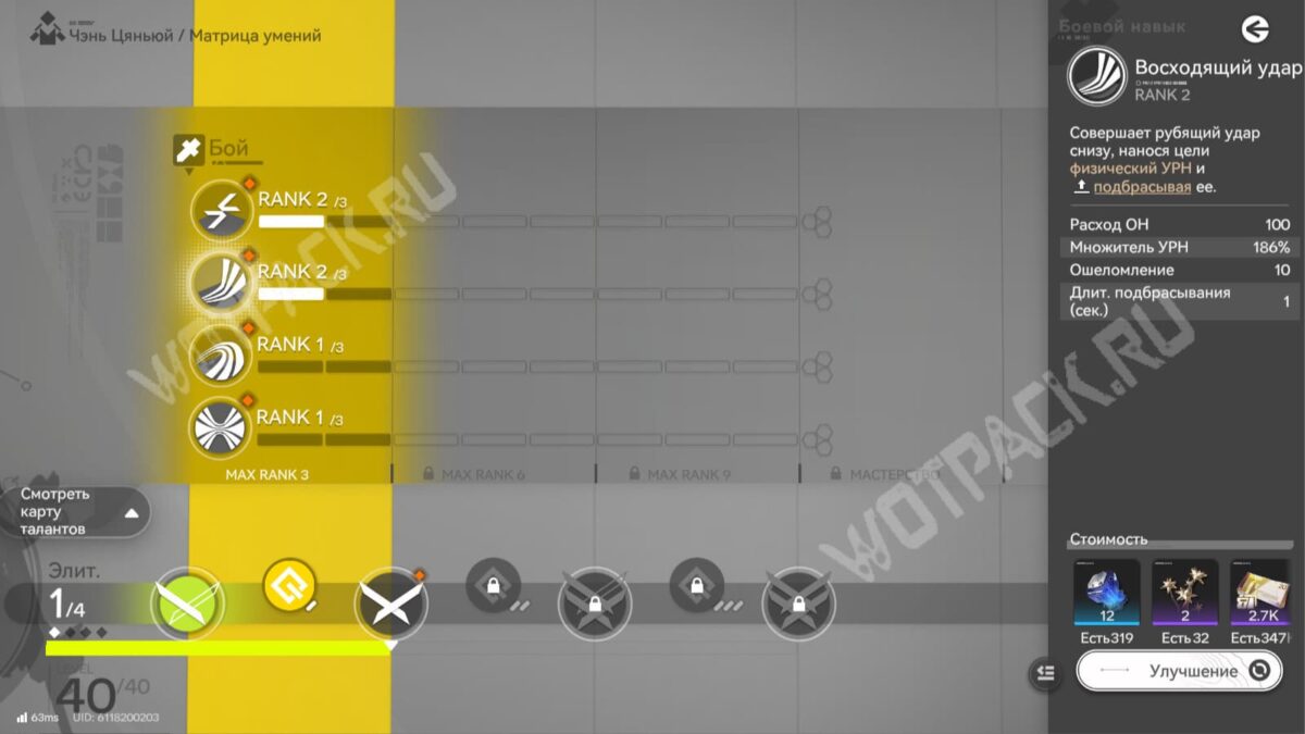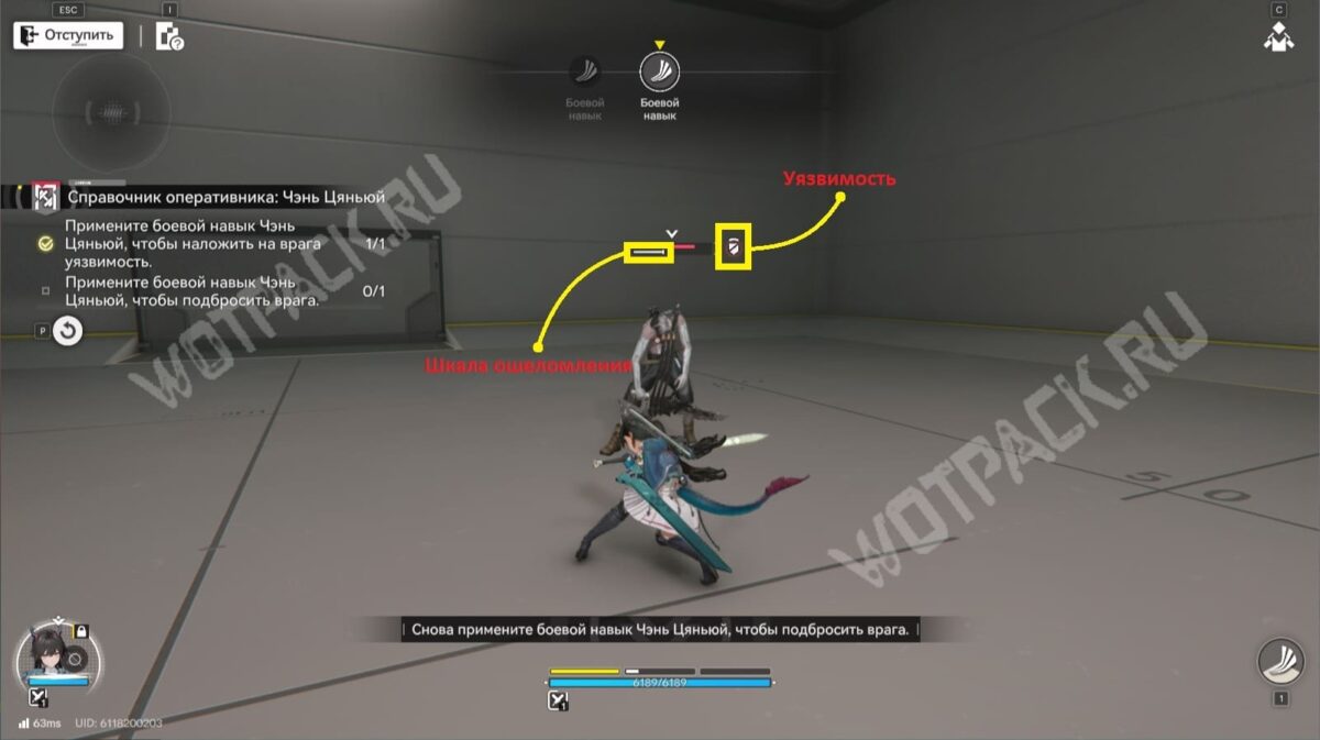 - Б/н «Восходящий удар» — подбрасывает врага и делает его уязвимым. Если цель уже подвержена второму негативному статусу, накладывает 1 заряд уяза и ошеломляет.
