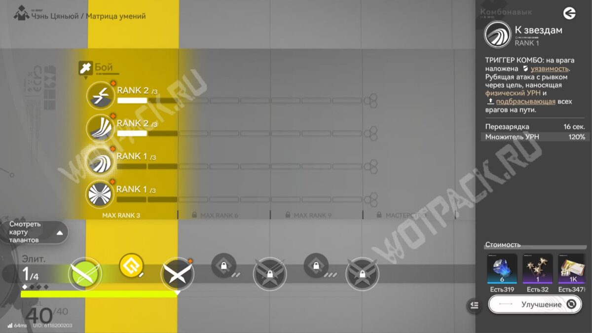 - Комбо «К звёздам» — триггерится, когда противник становится уязвимым. После применени подбрасывает основную цель и монстров на пути.