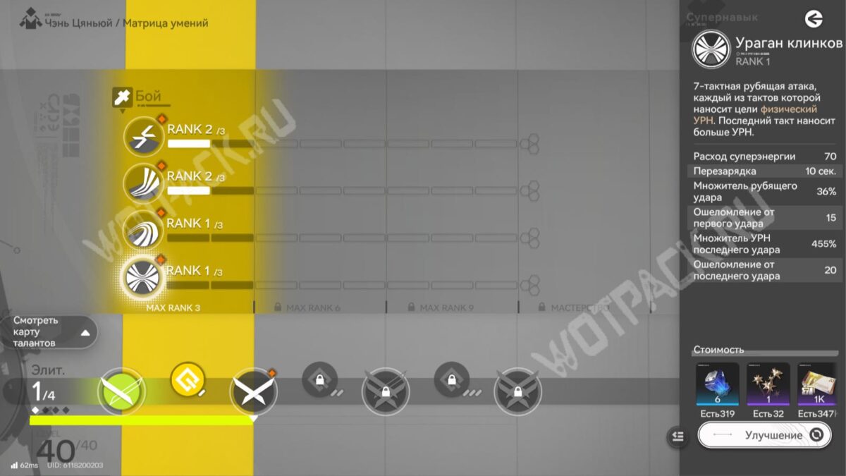 - Ульта «Ураган клинков» — основной источник дамага, при котором Цяньюй проводит серию рубящих ударов и ошеломляет.