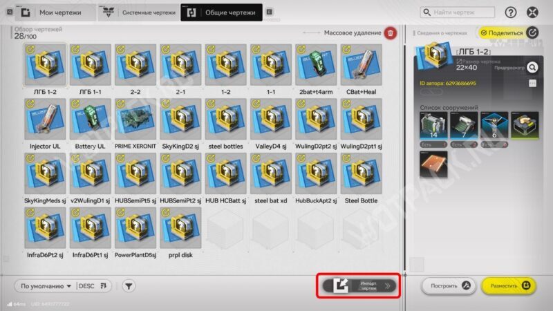 - Находясь в области базы, нажмите «Чертежи» справа внизу. Перейдите на вкладку «Общие чертежи» и нажмите кнопку «Импорт. чертеж».