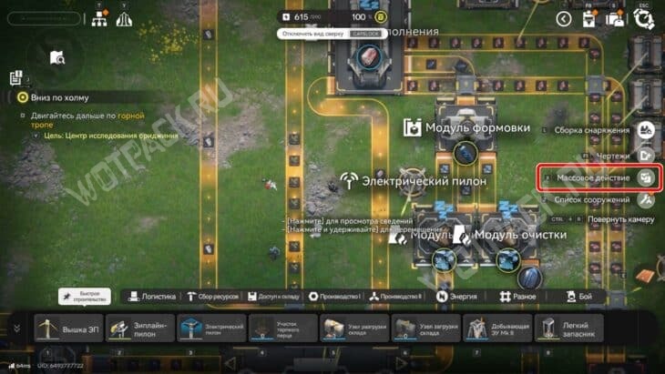 - С помощью функции «Массовое действие» выделите все нужные постройки. У мобильных юзеров эта функция появляется при нажатии на серую кнопку «Набор инструментов» справа.