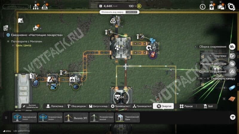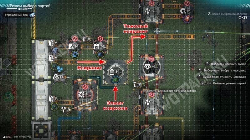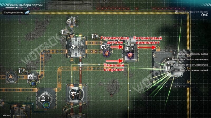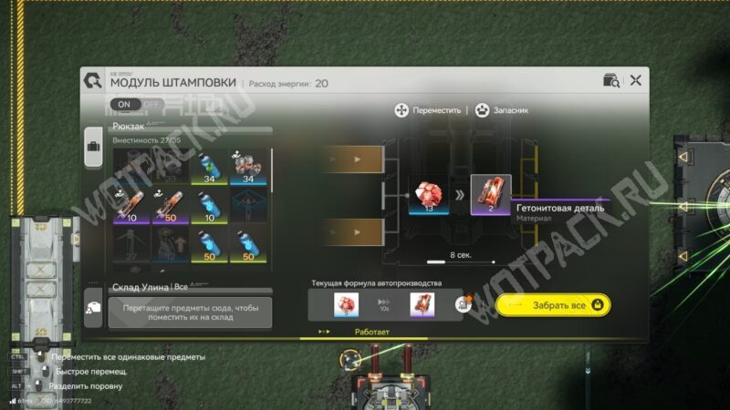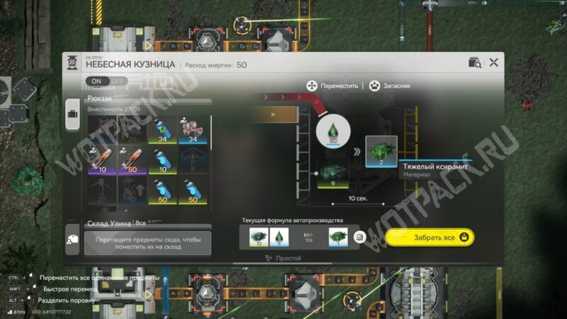 Последний этап — вывести подготовленные заранее гетонитовые детали и тяжелый ксиранит в модуль снаряжения. В нём сырьё автоматически превратится в готовые изделия, которые можно сразу отправить на склад.