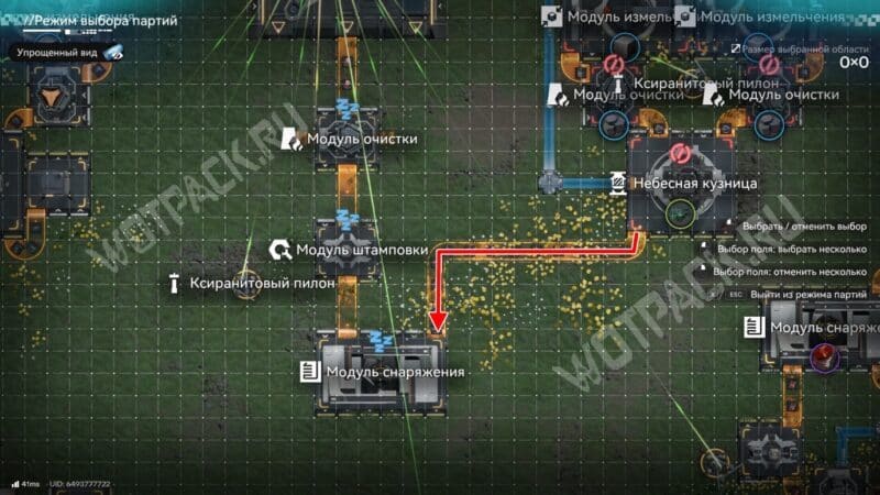 При построении цепочки важно определить, что происходит с ксиранитом на производстве. Если со всех кузниц он поступает в запасник, то проще вывести его от порта выхода ПБА или с узла разгрузки склада. В ином случае стоит протянуть ленту с зелёным порошком прямо от ближайшей небесной кузницы.