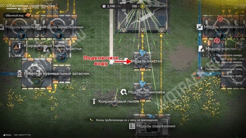 Разместите модуль снаряжения и подключите линию ксиранита