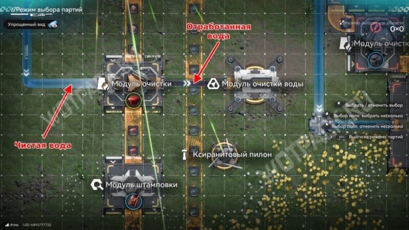 Чтобы схема заработала, подведите к порту входа жидкости чистую воду. Для отвода отходов постройте рядом модуль очистки воды или цепочку производства ксиркона для улучшенных батарей. В таком виде линия будет производить три куприевых компонента в минуту.