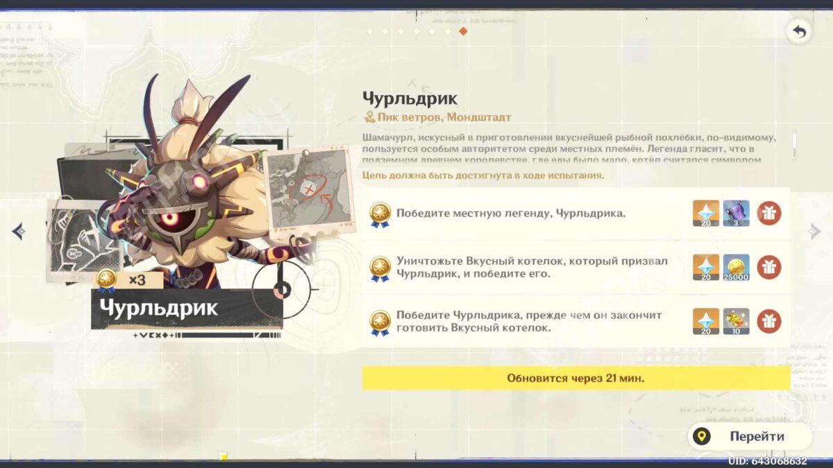 Чурльдрик простой, если есть Гео дамагер или компаньон с клеймором: от его атак не сложно уклониться, а на котёл отводится достаточно времени при наличии Гидро саб-дд. Рекомендуем почитать в отдельной статье о других местных легендах.