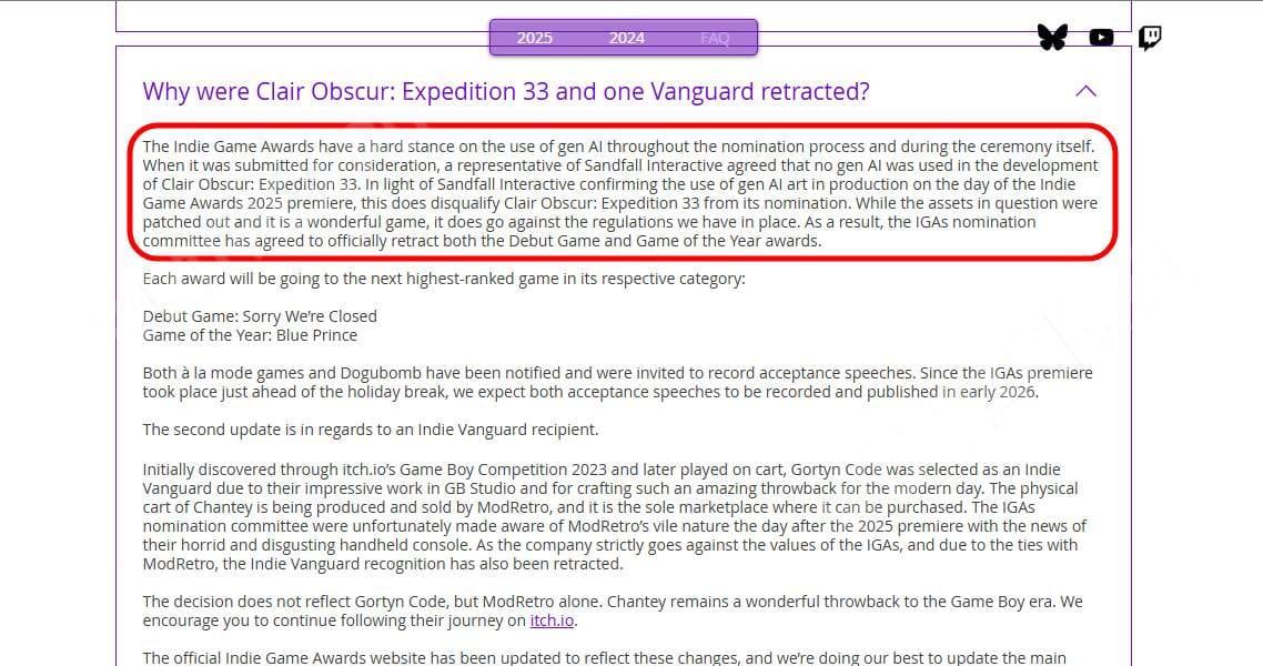 Организаторы Indie Game Awards 2025 отозвали награды Clair Obscure: Expedition 33 в номинациях «Игра года» и «Дебютная игра». Своё решение они мотивировали тем, что разработчики «Экспедиции» прибегли к использованию ИИ, который является основанием для недопуска к участию в церемонии.