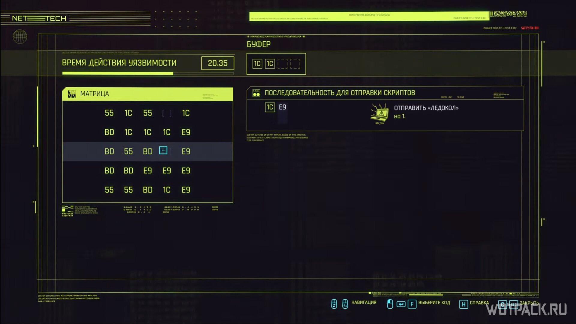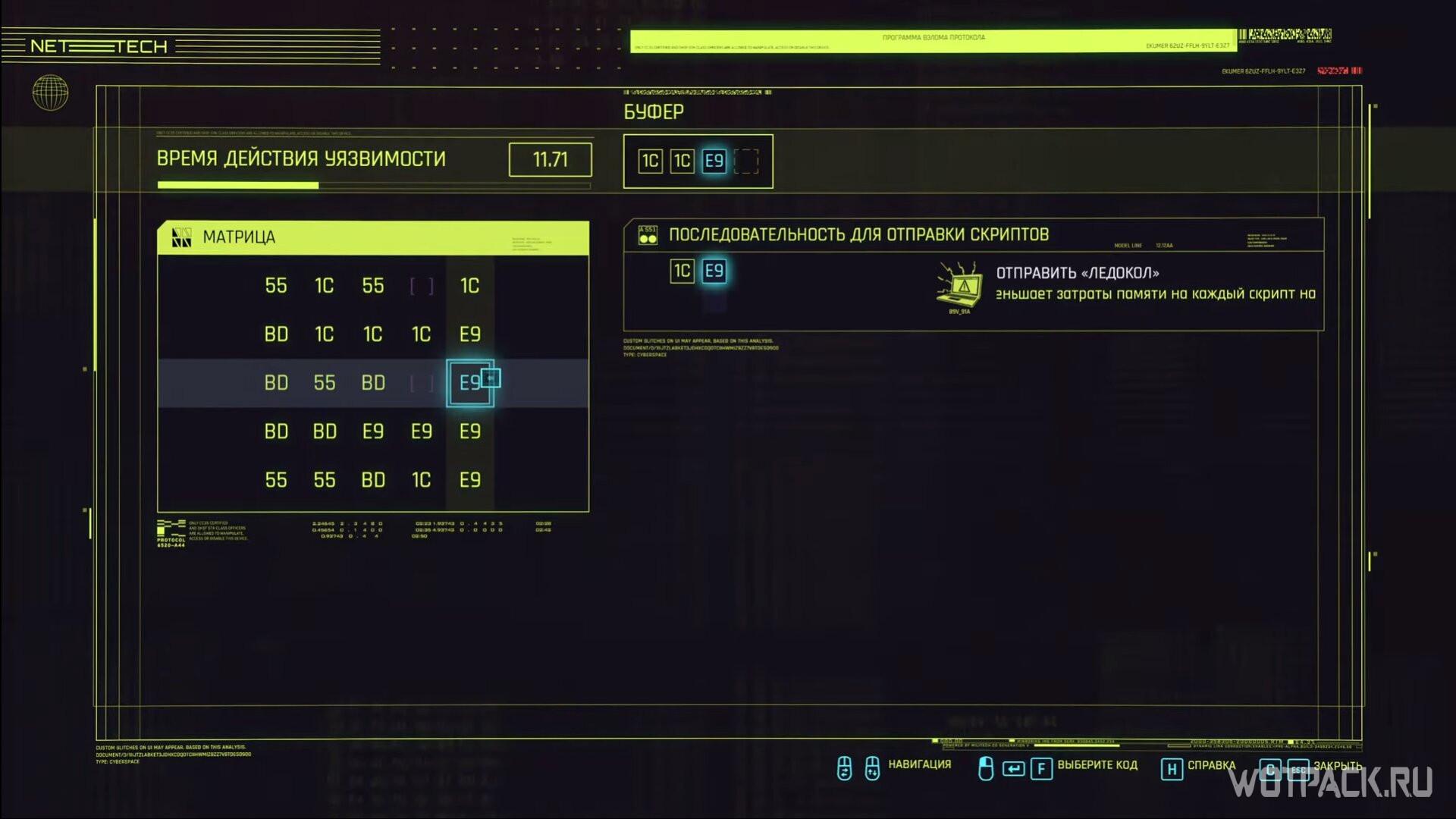 - Время действия уязвимости. Панель находится над матрицей. Указывает на то, сколько времени вам будет отведено для взлома. Отсчет начинается с момента введения первого символа.