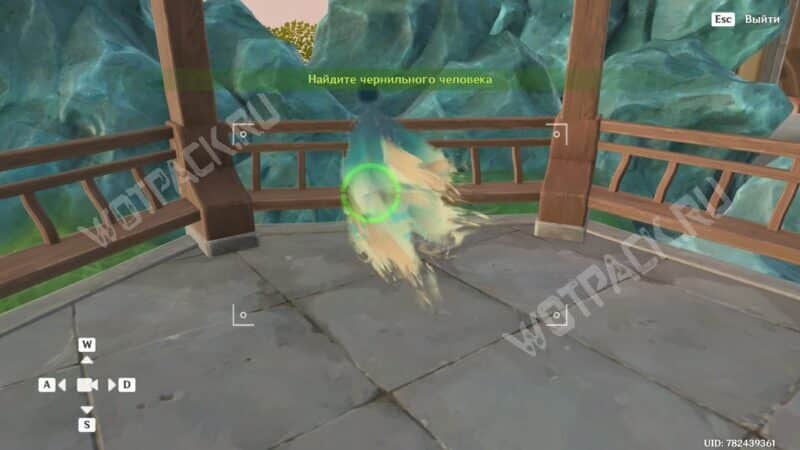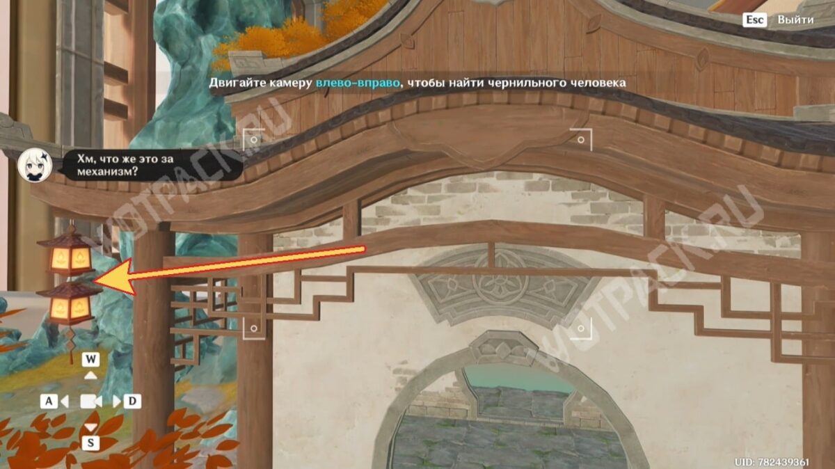 Затем тщательно осмотрите бонсай. Двигайте камеру влево, чтобы найти чернильного человечка — искомый силуэт расположен под беседкой.