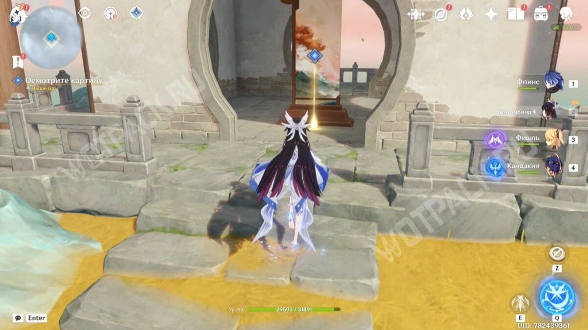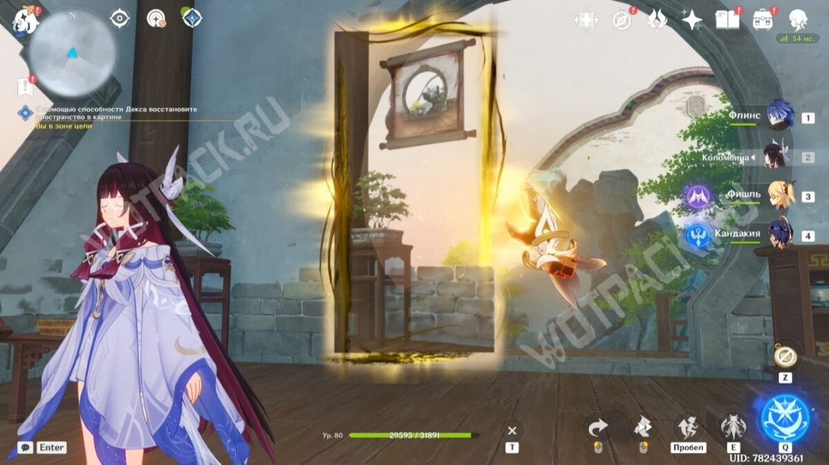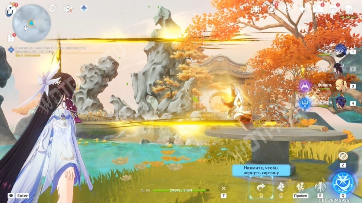Продолжайте следовать за странным чернильным пятном. Вскоре оно приведёт к деревянному столику, на котором лежит картина с запечатанным пространством. Используйте Декса (по умолчанию «T») и совместите изображение с соответствующей локацией в реальности. Для этого подведите пейзаж к скале и разрушенным воротам.