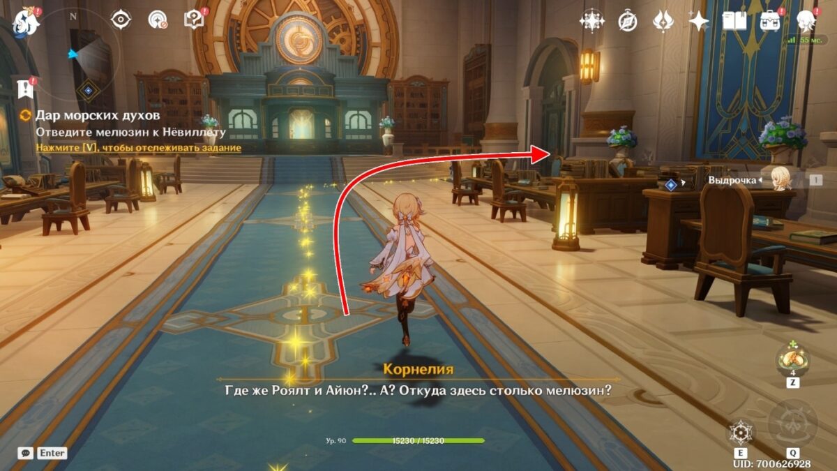 Отведите мелюзин к Нёвиллету, проследовав через холл к его кабинету. Получив подарок, Юдекс переоденется и тем самым выразит свою благодарность им.