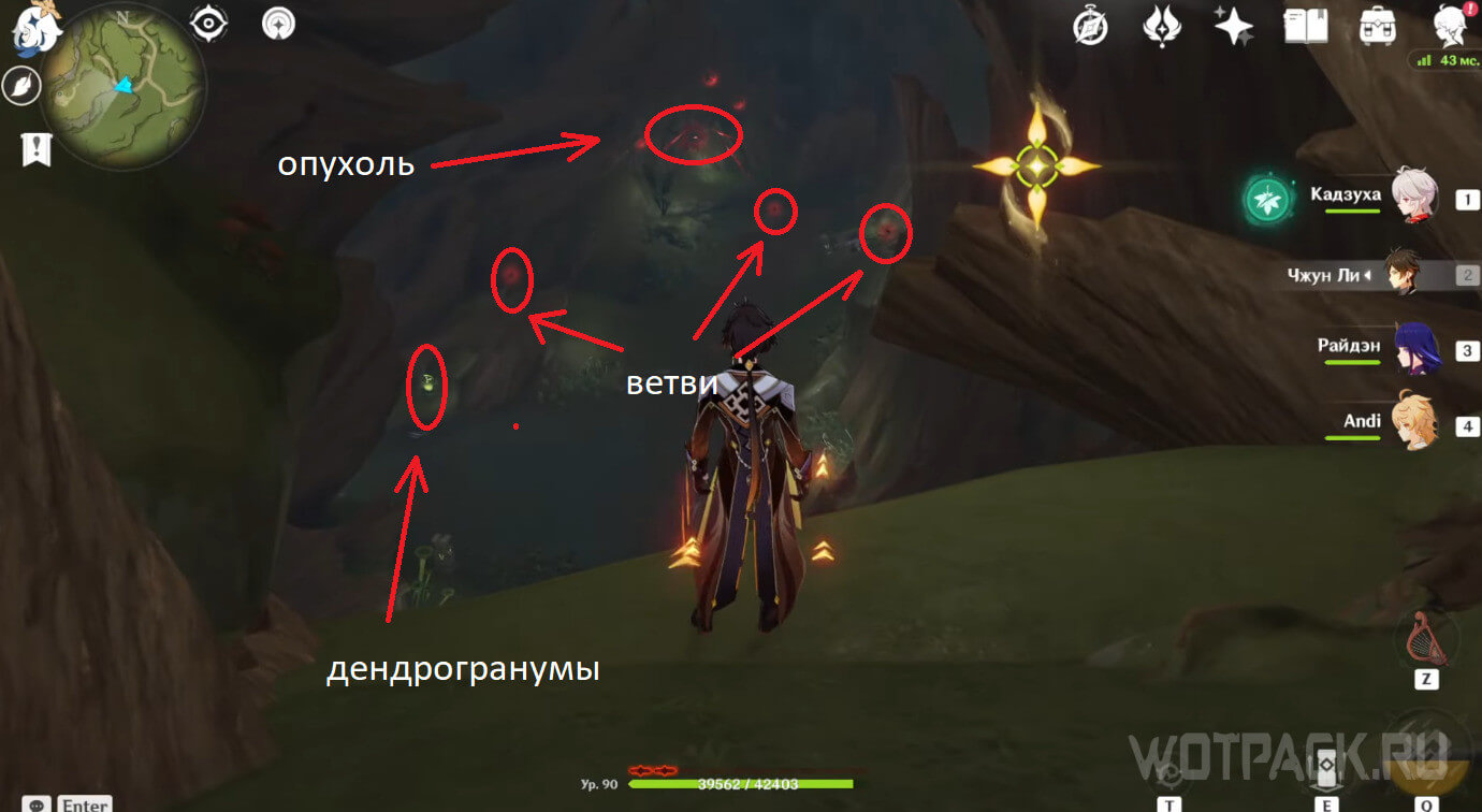 Когда окажетесь внизу, то с края обрыва увидите зону Увядания и все три ветви. Спрыгните и возьмите Дендрогранумы, которые расположены слева. В этот момент появятся щенки разрыва, которых потребуется одолеть. Подойдите к ветви и ударьте по ней заряженной атакой (либо выстрелите из лука), чтобы «исцелить» ее.