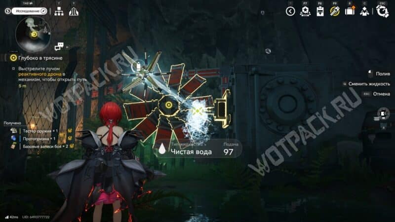 Когда на пути встретятся ворота Тантан, откройте их с помощью реактивного дрона. Подберите ферриевые бутылки с водой из ящика с припасами, выберите инструмент «Спрей» и направьте струю на лопасти механизма.