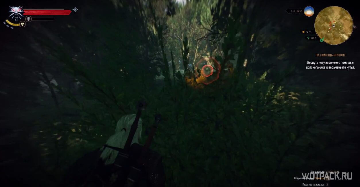 Как только закончите разговор, воспользуйтесь ведьмачьим чутьем и заметите на земле следы животного. Следуйте по ним вглубь леса, но остерегайтесь врагов: по пути встретите 4 волков. После убийства хищников начнете слышать звуки, которые издает коза.
