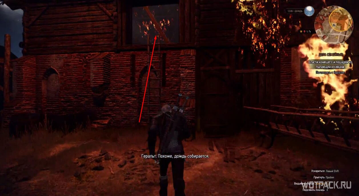 Рекомендуем все же помочь мужчине и освободить его. Двигайтесь к горящему зданию и заберитесь наверх по лестнице. Откройте сундук, стоящий слева, после чего двигайтесь направо.