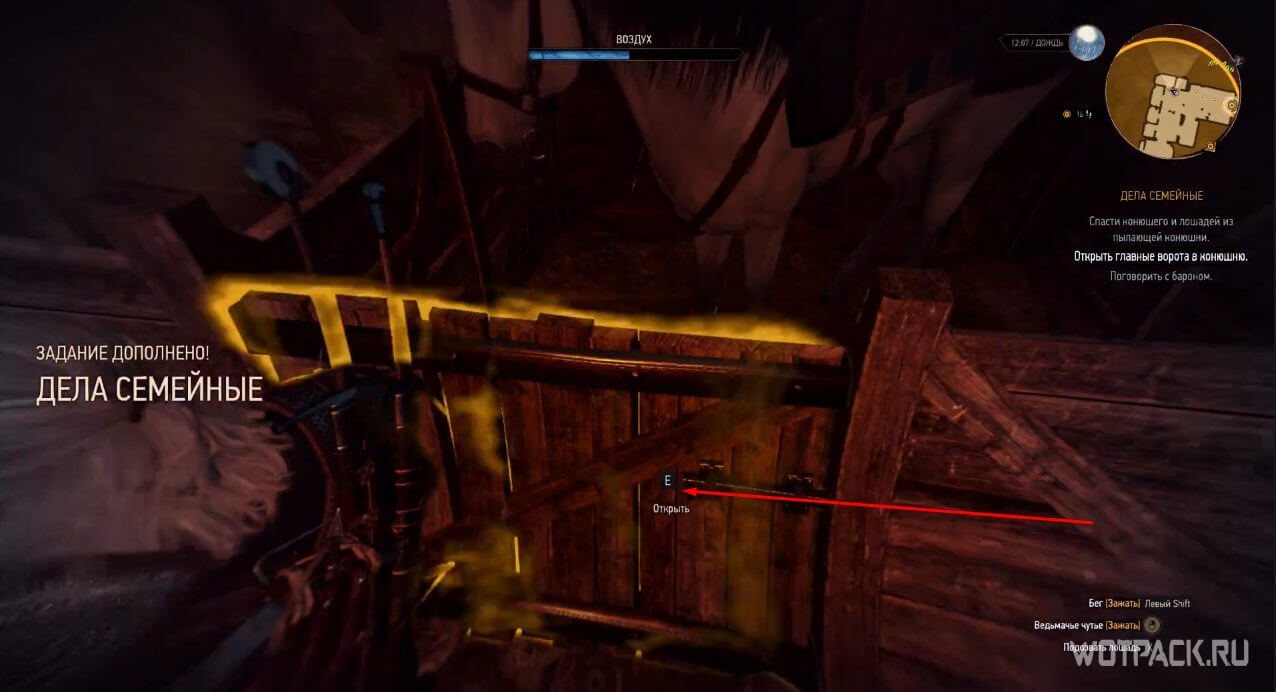 Спуститесь к стойлам и выпустите всех лошадей, после чего подойдите к большим воротам и откройте их. Все это время конюх будет кричать и звать на помощь, просто игнорируйте эти звуки. Выполнять действия нужно максимально быстро, так как запас воздуха кончается: восполнить его можно у главных дверей, отмеченных маркером.