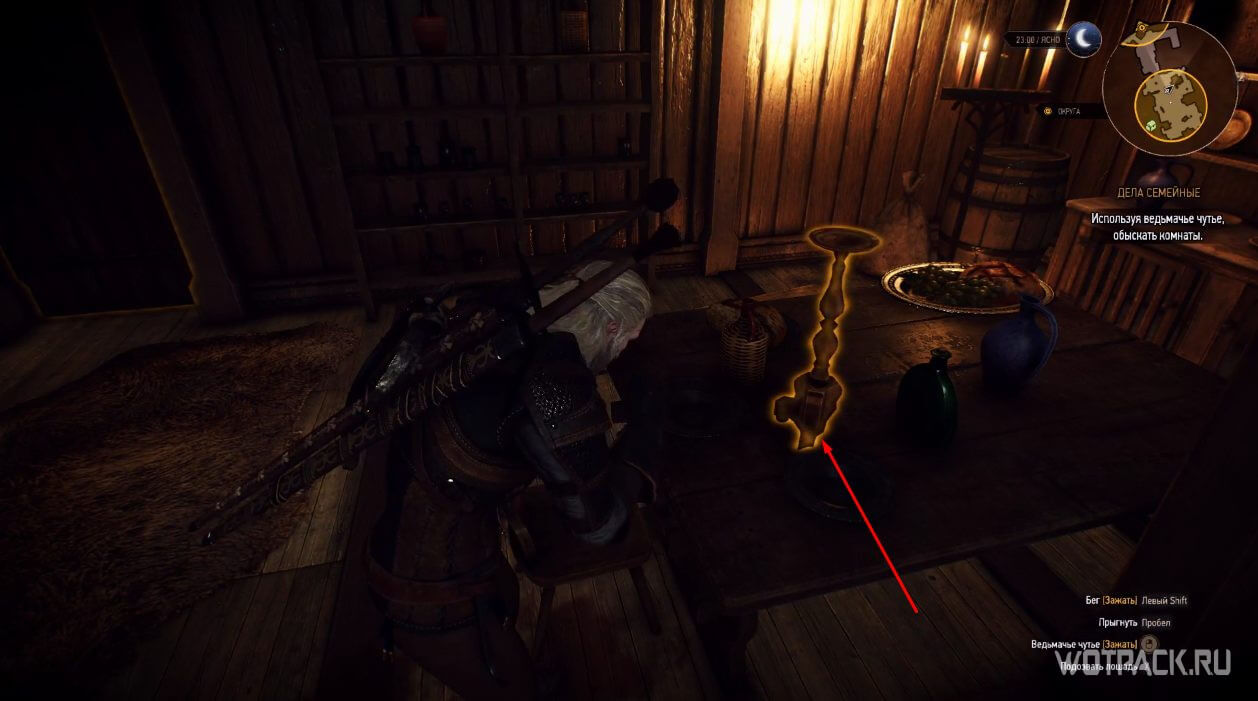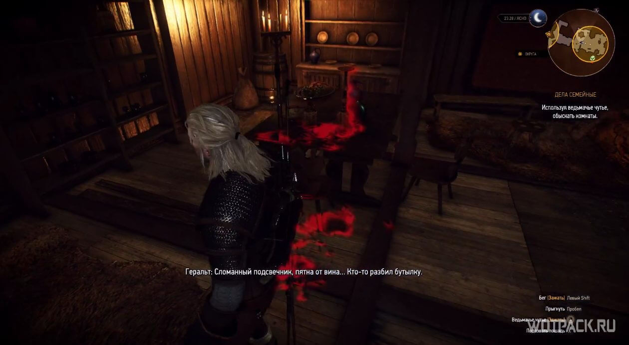 В комнате Анны, сверните налево и подойдите к столу: необходимо осмотреть деревянный подсвечник, чтобы обнаружить, что у него сломана ножка. Вокруг места для трапезы разлито вино. Неподалеку есть еще и голая стена, которую также нужно осмотреть, Геральт сделает вывод, что здесь что-то висело.
