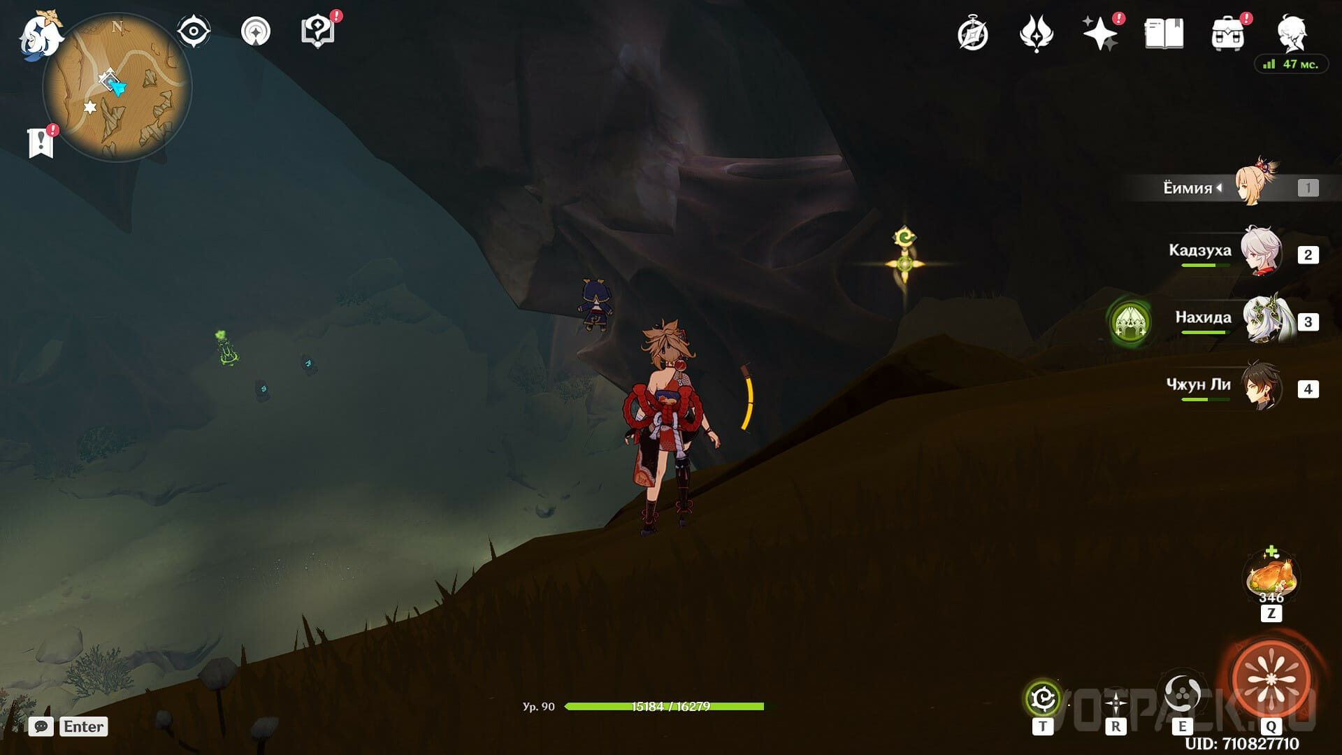 В небольшой пещере у воды. Спуститесь на дно ущелья и двигайтесь в сторону группы Гидро слаймов. После исследуйте пространство под мостом.