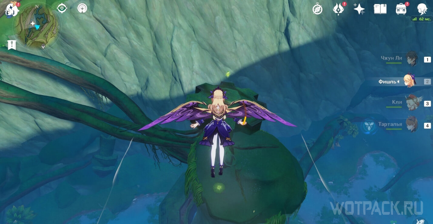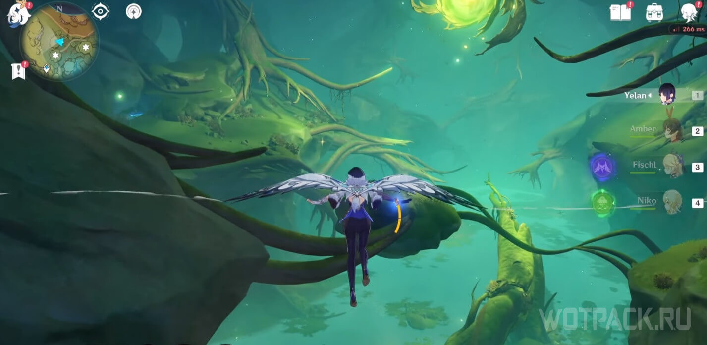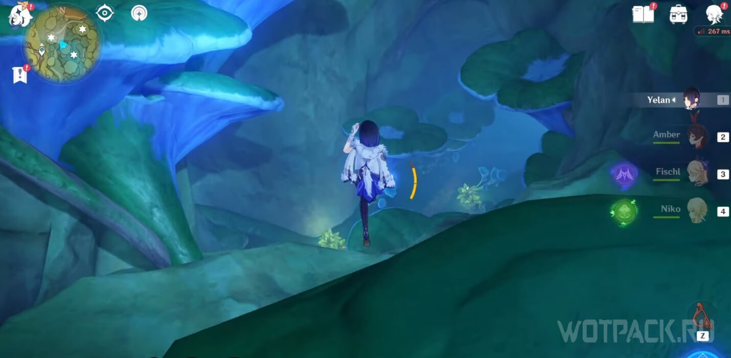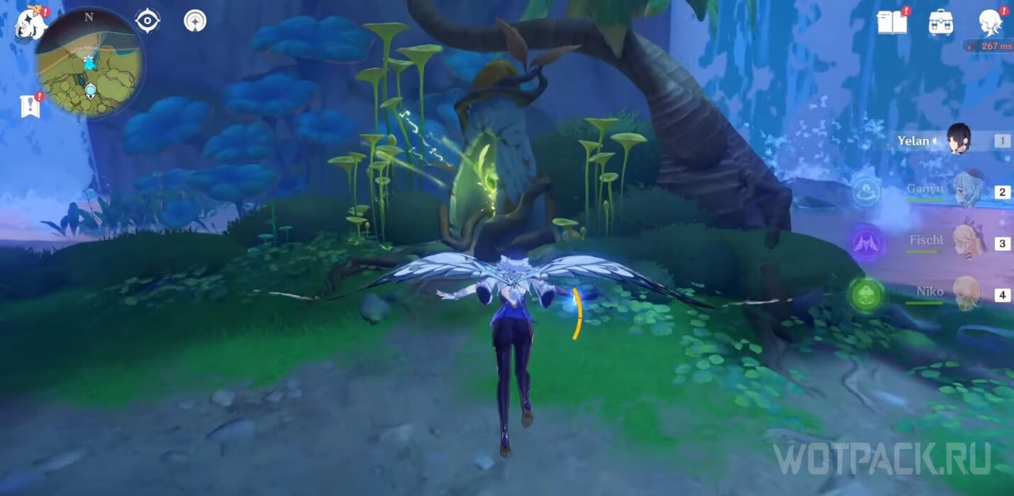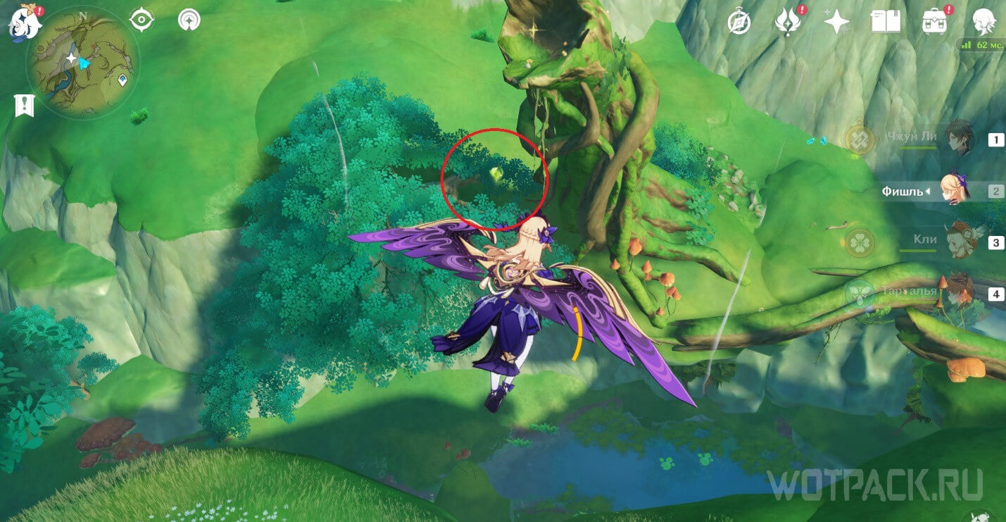 Высоко в воздухе. Поднимитесь наверх по четырехлистным символам, как по громовым сферам из Инадзумы. Скорости подъема будет достаточно, чтобы забрать добычу. Для высокого прыжка используйте пружинистые грибы, предварительно усиленные Электро.