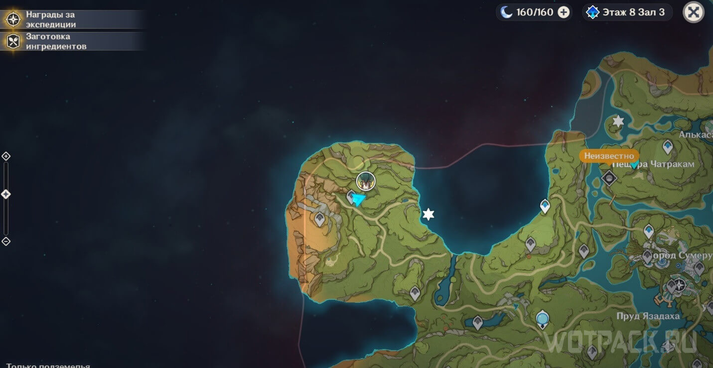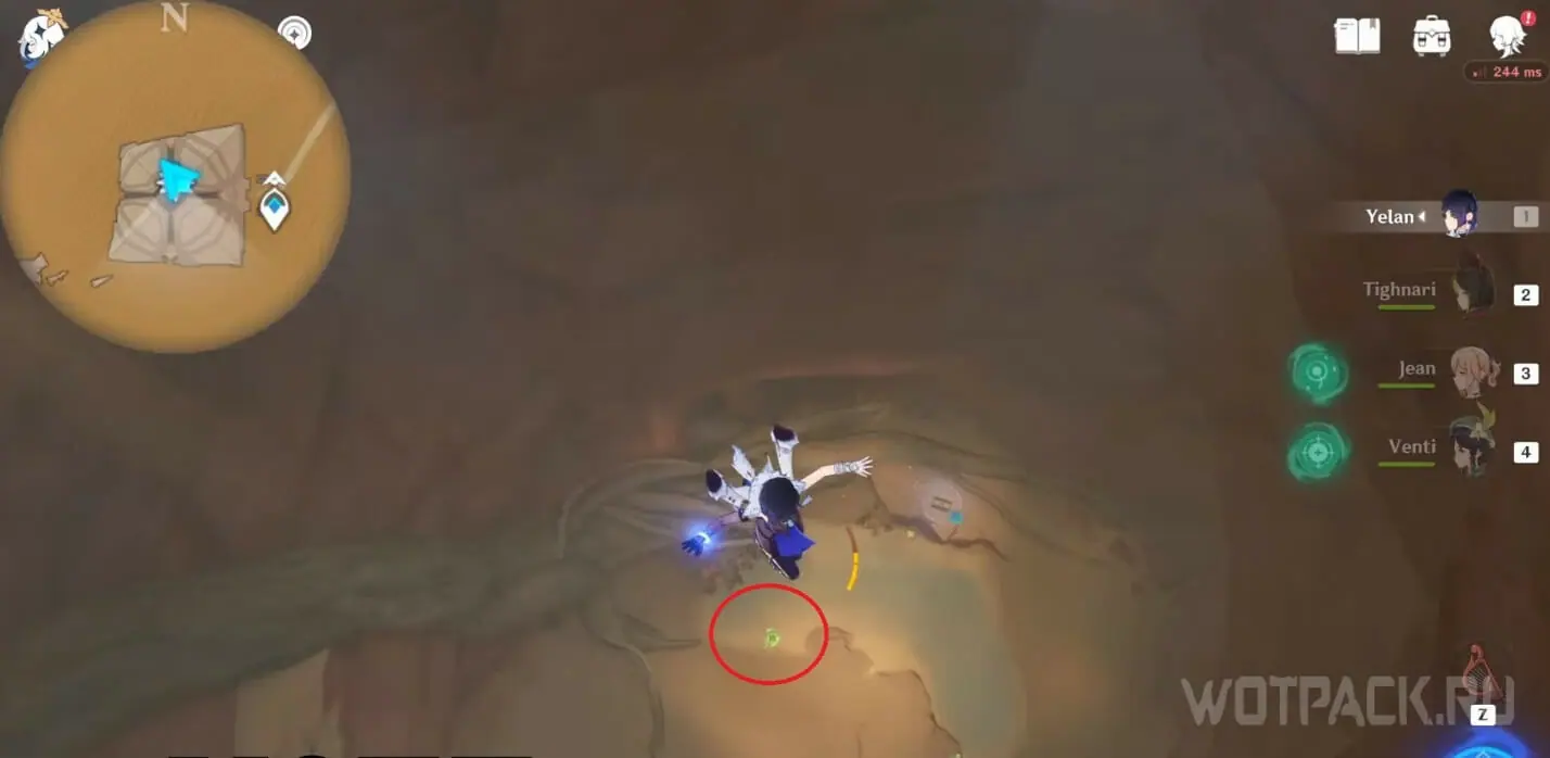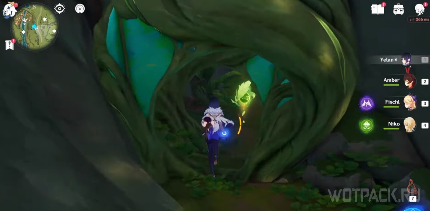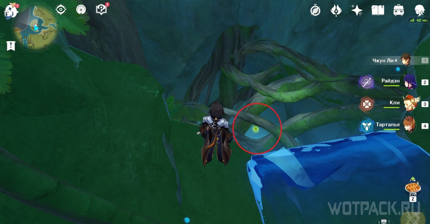 От подземного телепорта идите прямо к месту, где стоят Дендро монументы и летает Крио плесенник. Далее идите правее в небольшое пространство под корнями.