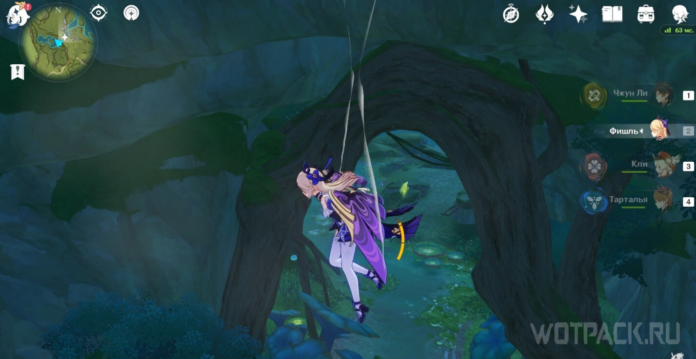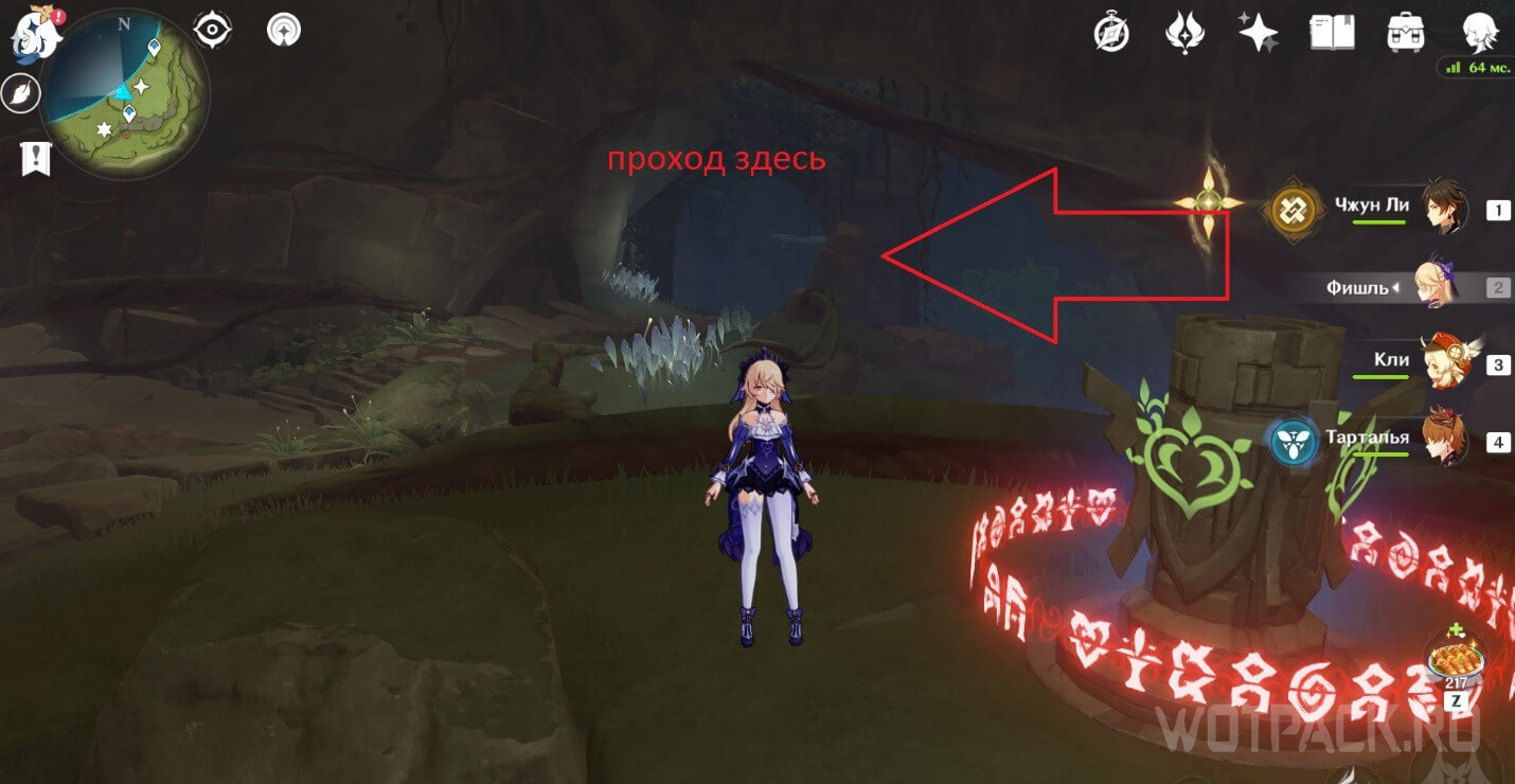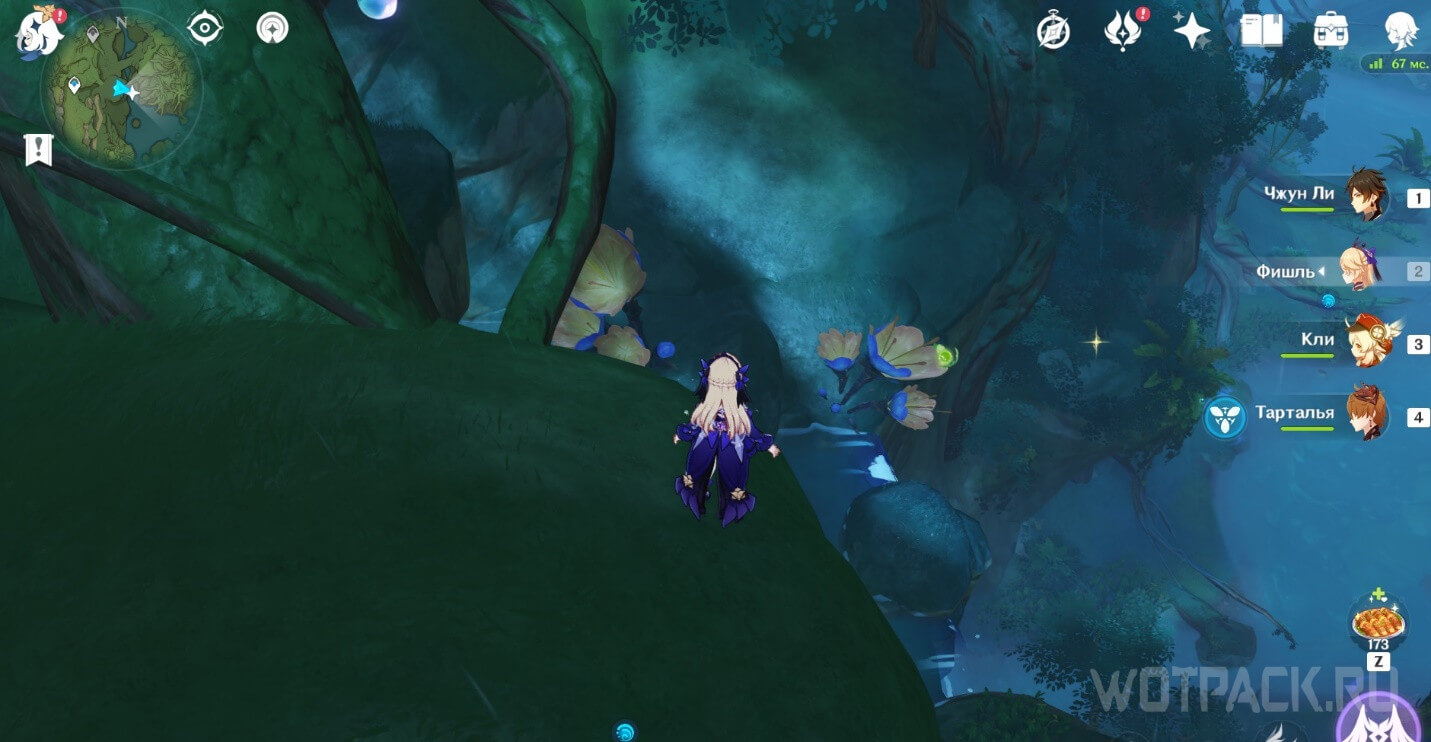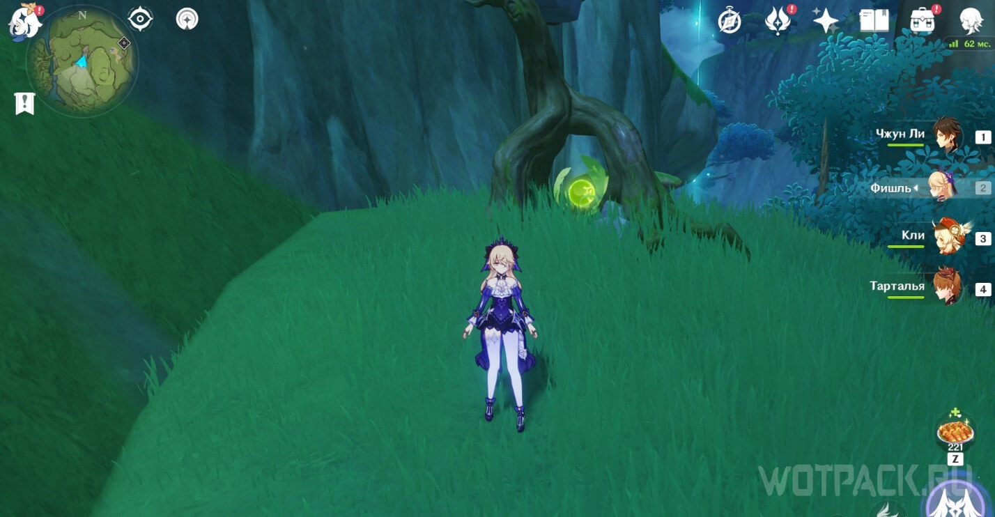 От подземного телепорта идите прямо к месту, где стоят Дендро монументы и летает Крио плесенник. Далее идите правее в небольшое пространство под корнями.