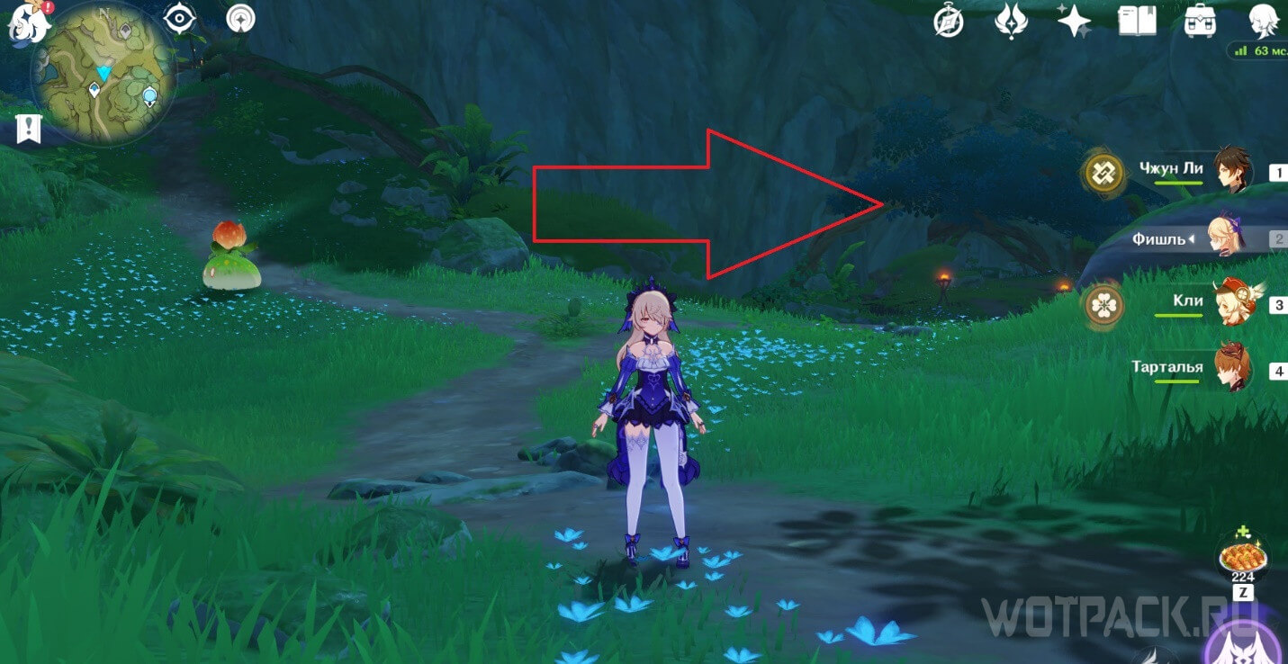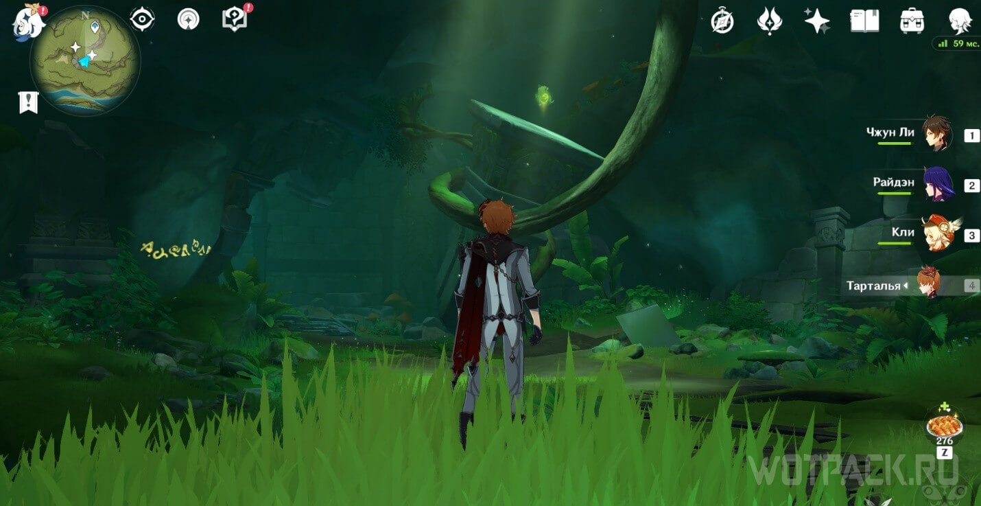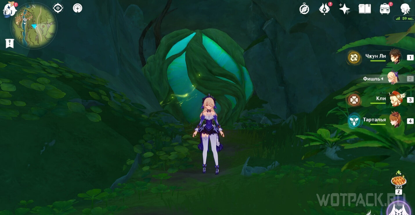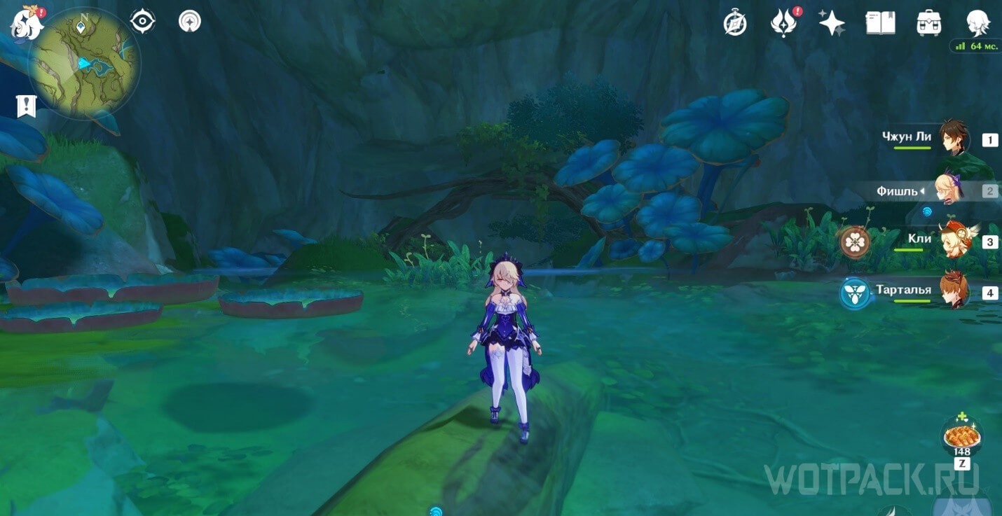 От подземного телепорта идите прямо к месту, где стоят Дендро монументы и летает Крио плесенник. Далее идите правее в небольшое пространство под корнями.