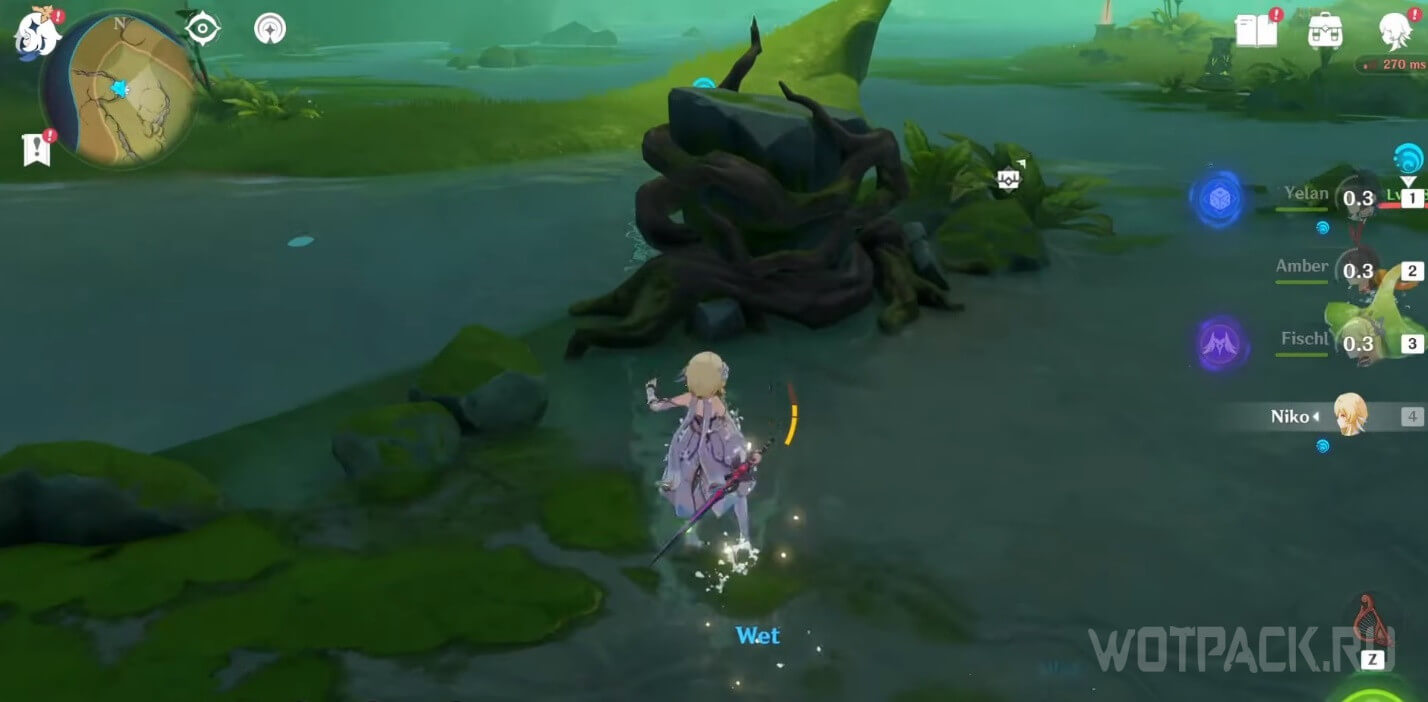 В ее дальней части, в воде, находится увитый корнями камень, на котором необходимо применить силу Дендро, чтобы пробудить лозы. Они поднимут булыжник и откроют доступ к окулусу.