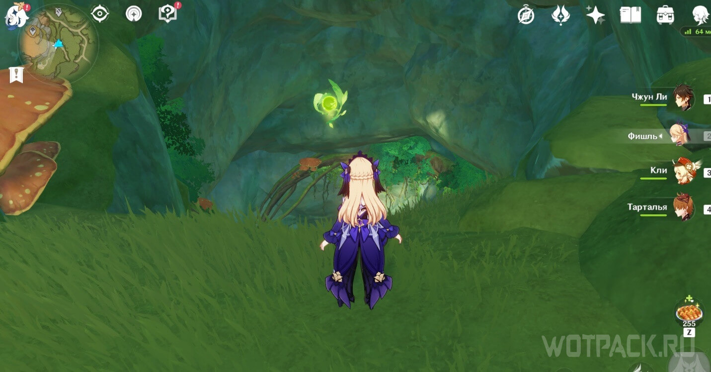 На вершине шляпки огромного гриба, чуть южнее статуи Архонта в этой области. Можно спланировать со скалы (со стороны Ли Юэ) или подняться с помощью четырехлистных символов. Рядом есть Анемо слаймы, которые могут создать проблемы.