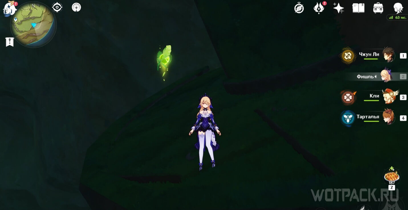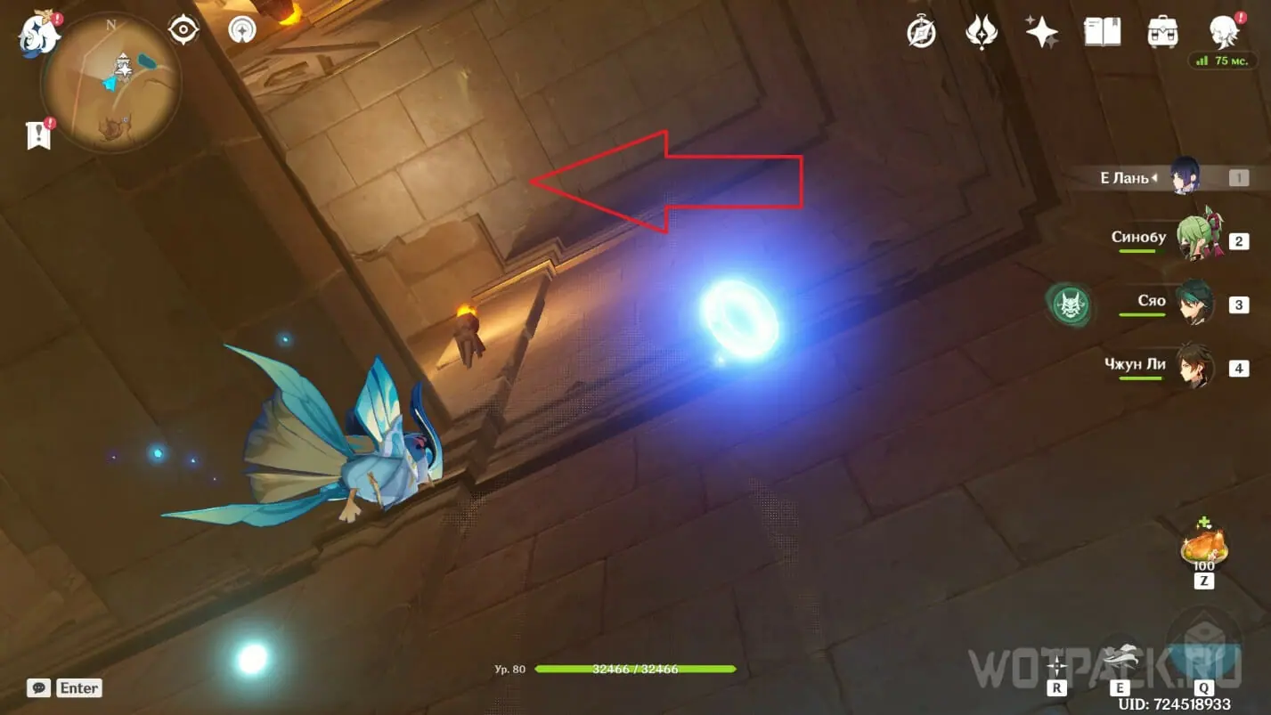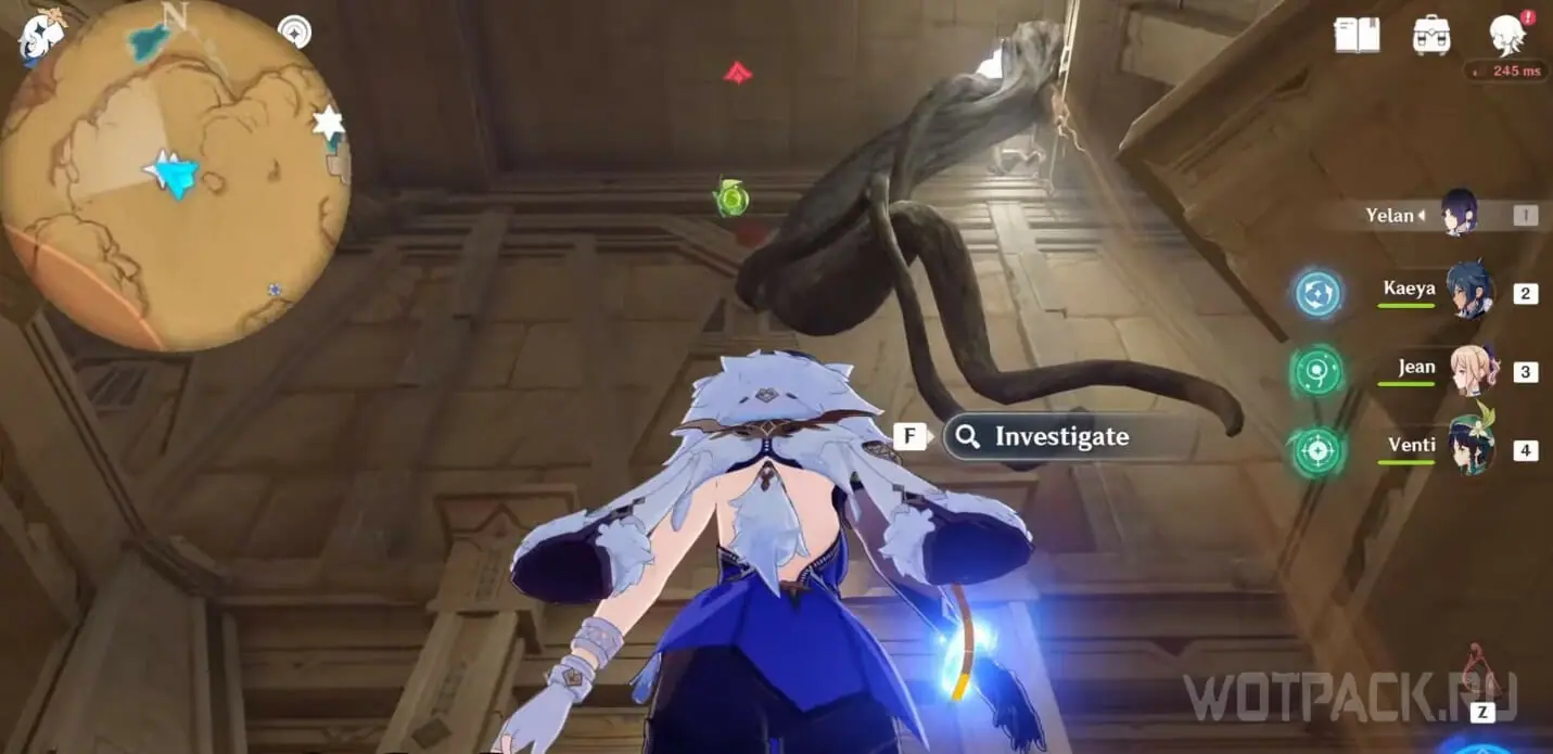 Сверните в левую дверь от подземного телепорта и пройдите мимо хиличурлов. Предмет находится под решеткой на потолке. Забраться наверх можно по трубам или по канатам.