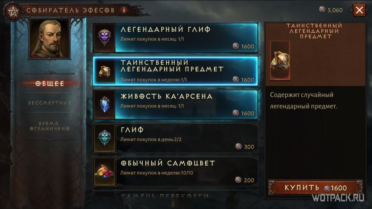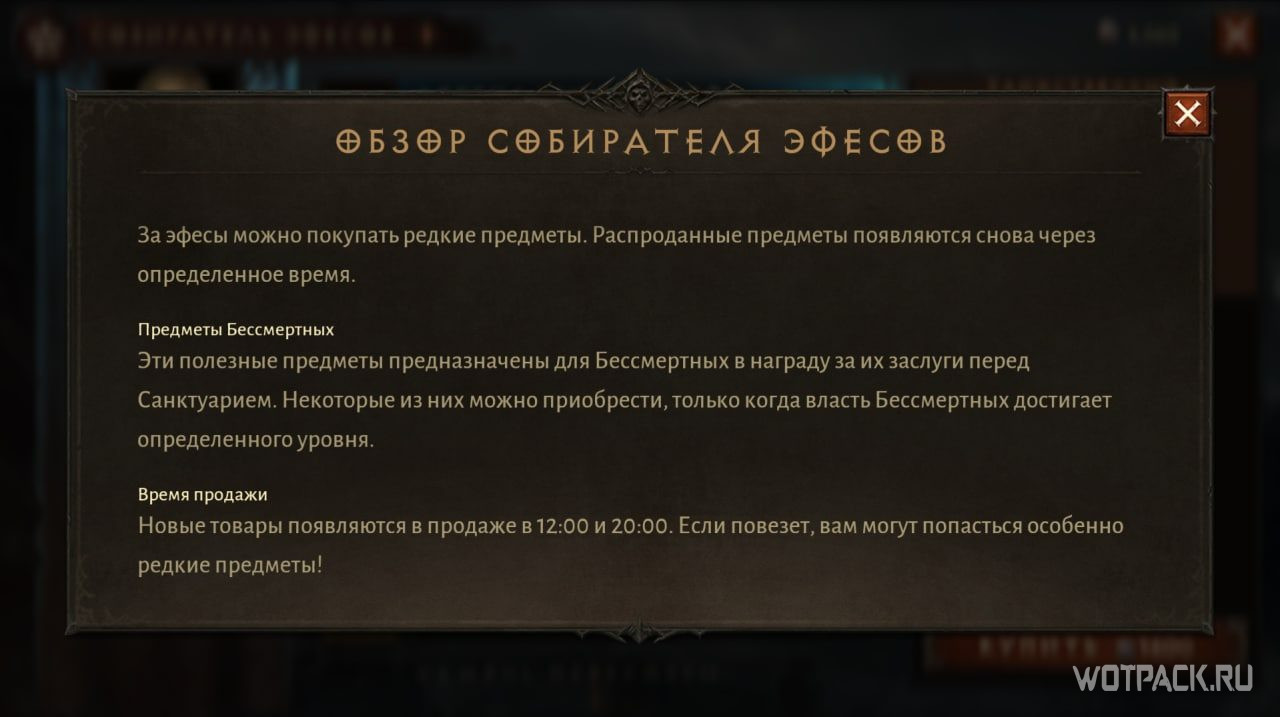 В Вестмарше, на северо-востоке от Дворцовой площади можно найти NPC-торговца – Собирателя Эфесов. Мужчина продает различные предметы, меняя их на эфесы – внутриигровую валюту, зарабатываемую за различные активности, в том числе и за Портал Дерзаний. В ассортименте торговца присутствуют глифы для порталов и самое интересное – случайный легендарный предмет. Тираж товара ограничен, но через некоторое время снаряжение появляется в продаже снова.