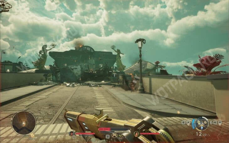 Отправляйтесь к городу. По дороге с посадочной площадки столкнётесь с группой враждебно настроенных автоматонов. Разобравшись с ними, осмотрите тело солдата Часкарилло, чтобы забрать памятный тосбольный мяч.
