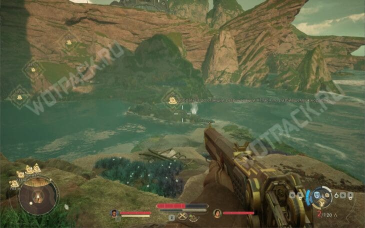 От Вестпорта бегите в направлении побережья, где обнаружите обломки разбившегося корабля. С их помощью сможете перебраться на противоположную сторону.
