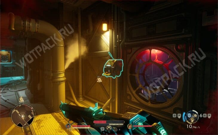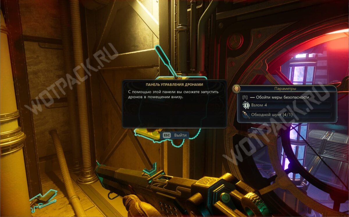 В процессе наткнётесь на устройство с рычагом, которое запускает дронов в помещении внизу. Для обхода мер безопасности необходим обходной шунт, а также Взлом 4.
