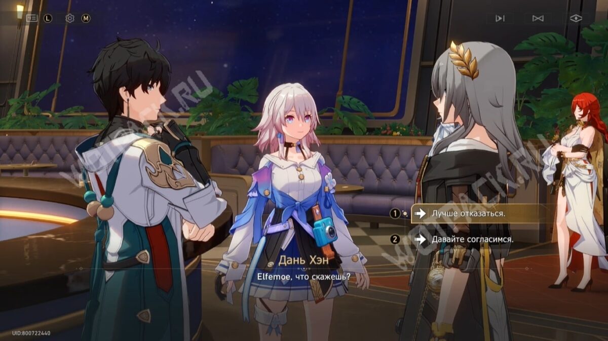 Узнайте, какого мнения придерживается каждый из Безымянных, обсудив произошедшее с Дань Хэном и Март 7, а также Химеко, Вельтом и Пом-Пом. В процессе столкнётесь с выбором: