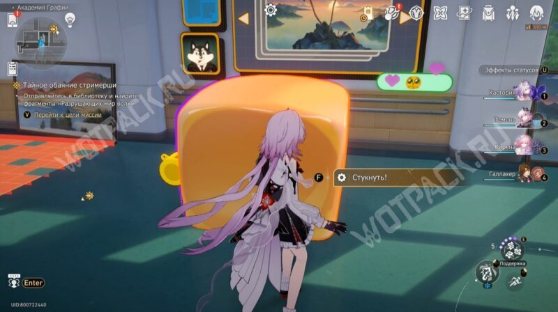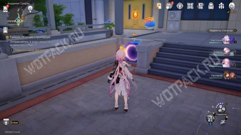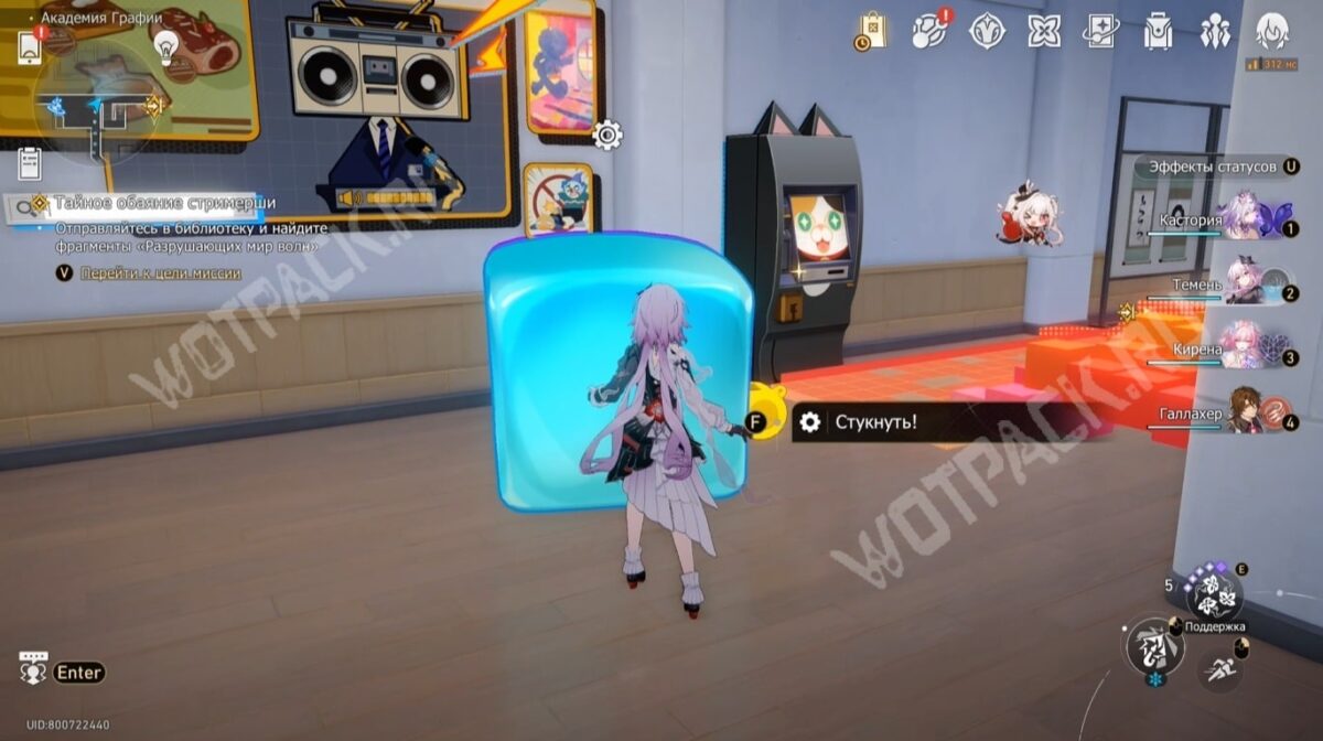 - После запуска «Мультистриминга» отправьте гипер-керри на второстепенное поле. Другие персонажи останутся на основной площадке и продолжат распространять статусы поддержки (баффы/щиты/исцеление). Эффекты будут действовать на кора даже при том условии, что он находится в другом измерении.