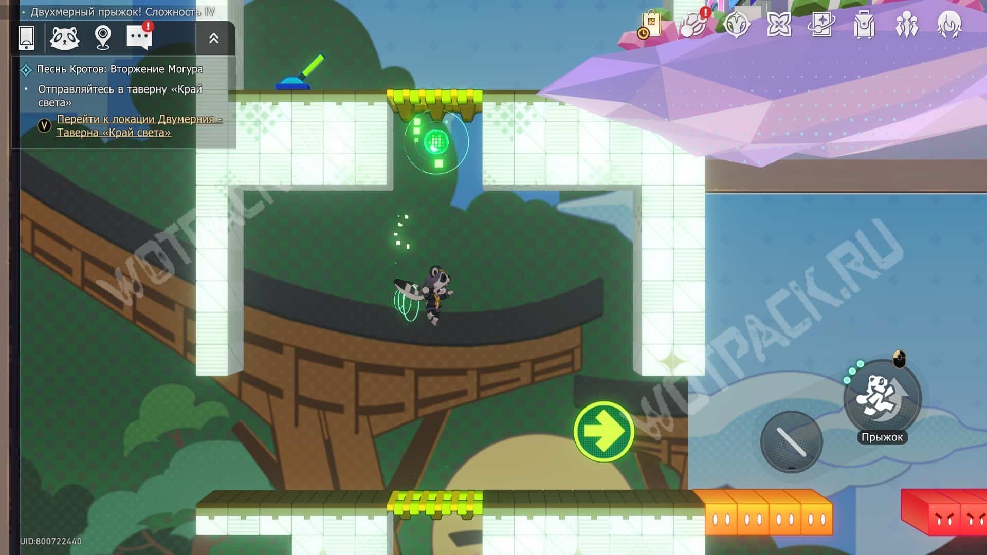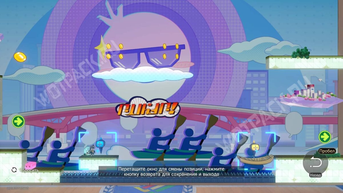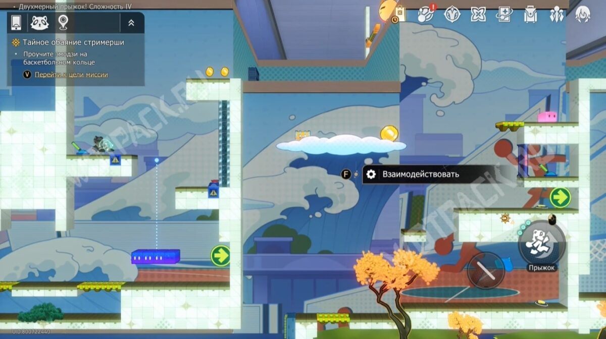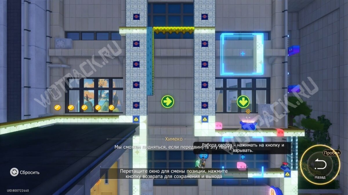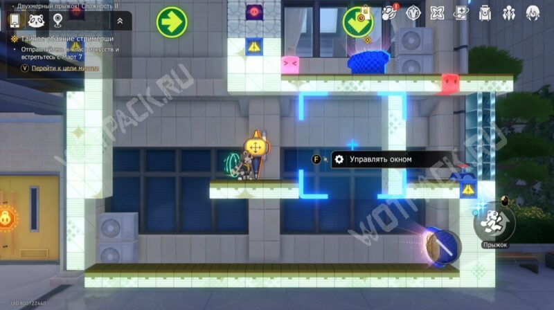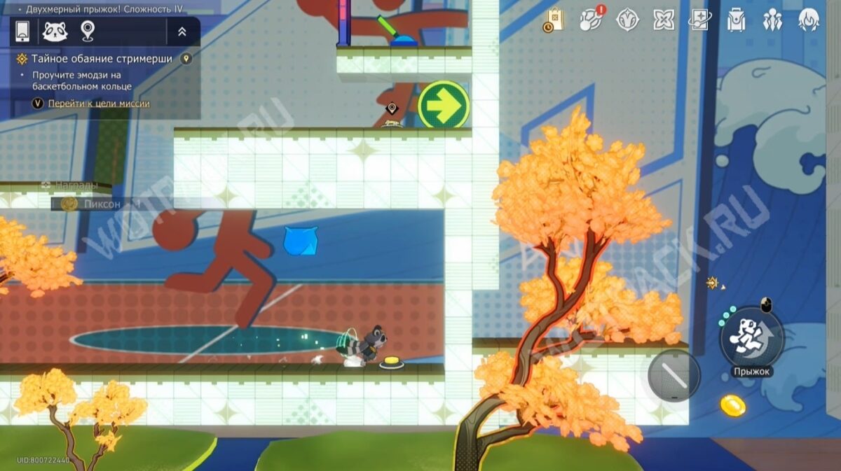 Активировав «Двухмерный прыжок! Сложность 1», сядьте на лодку и соберите пиксоны. Затем встаньте под сферой энергии прыжка: нажмите «ЛКМ» три раза и, в полёте восстановив заряды, доберитесь до верхней платформы.