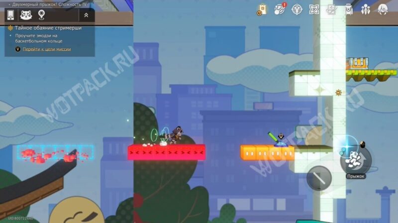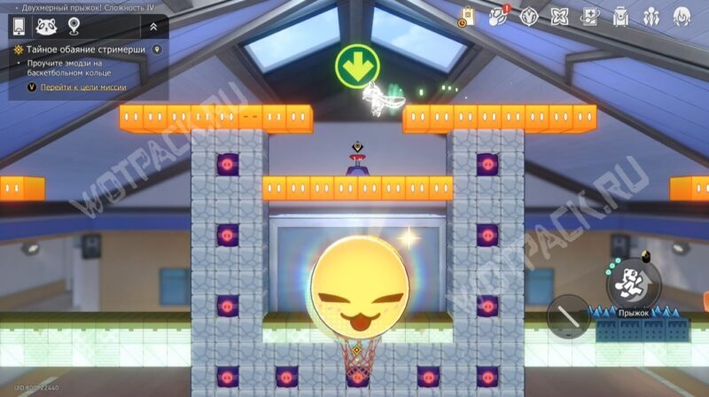 После доберитесь до ещё одного аппарата, маневрируя между энгри-платформами. Он откроет доступ к телепорту, ведущему к эмодзи над баскетбольным мячом. Следуйте подсказкам маркера и победите «смайлик».