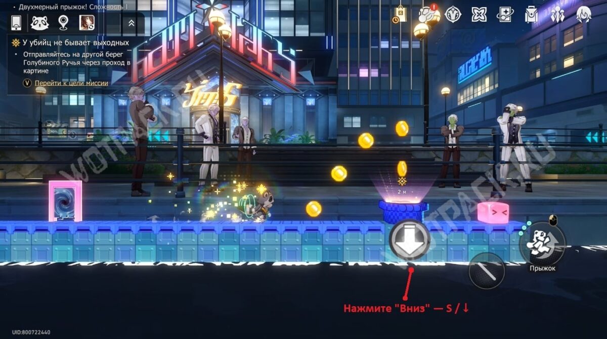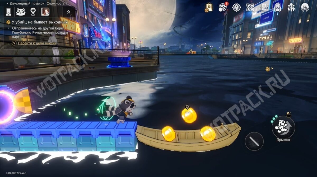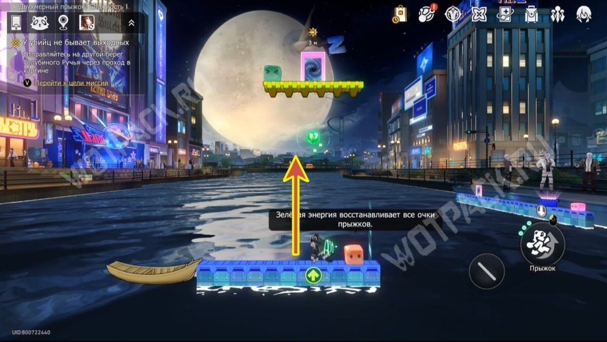 Активировав «Двухмерный прыжок! Сложность 1», сядьте на лодку и соберите пиксоны по пути. Затем встаньте под сферой энергии прыжка: нажмите «ЛКМ» доступное количество раз и, в полёте восстановив заряды, доберитесь до верхней платформы.