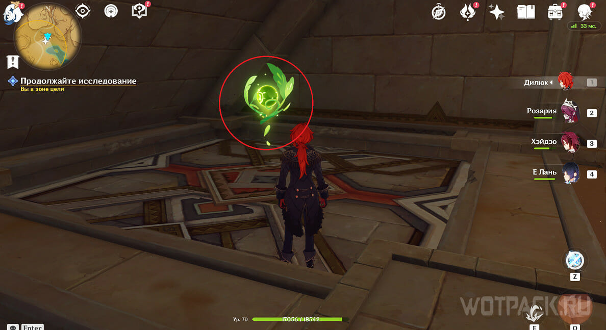 Пройдите за феей до конца коридора, поднимитесь по лестнице и когда окажетесь у еще одной треугольной двери, осмотрите пространство справа. В углу расположена груда камней с морой, а рядом с ними куча песка, которую нужно рассеять при помощи Анемо.