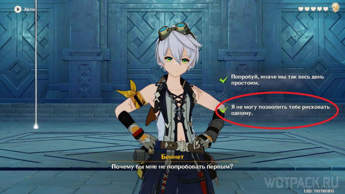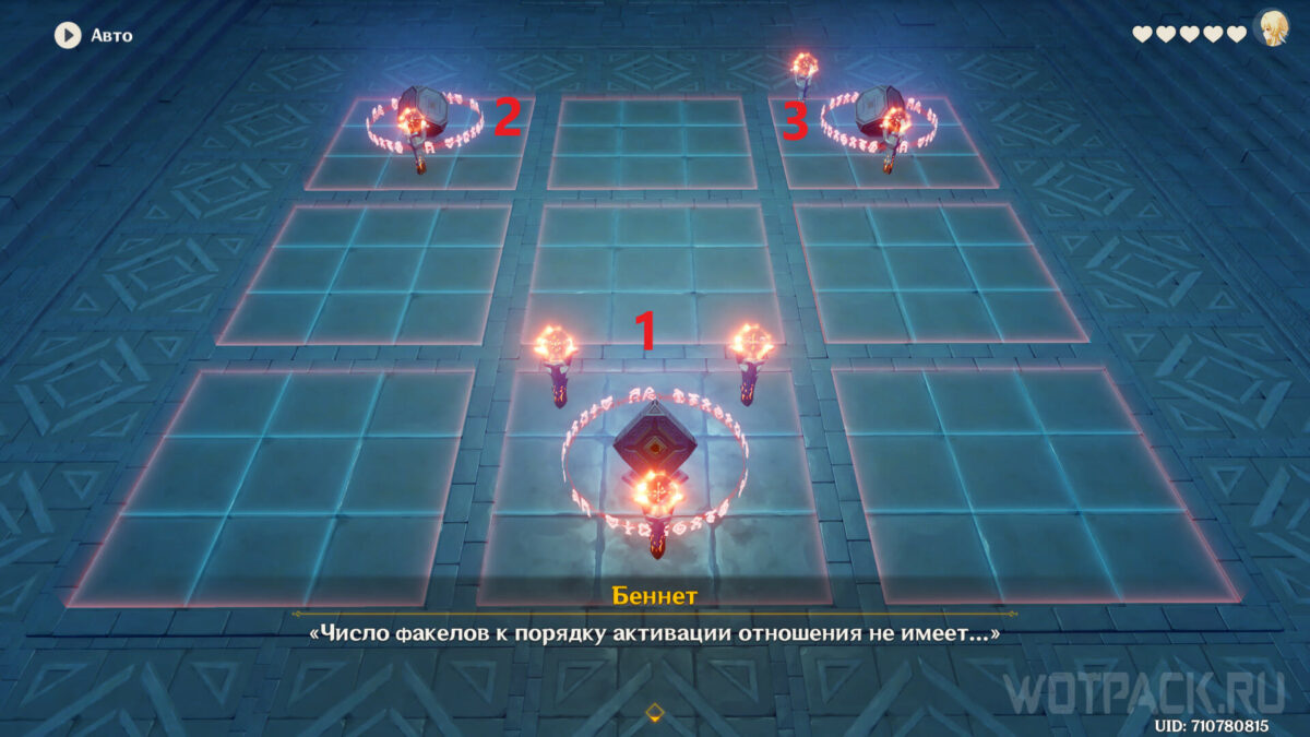 На первой головоломке необходимо выбрать ответ «Я не позволю тебе рисковать одному», чтобы активировать устройства одновременно с Беннетом и продвинуться дальше в руинах. В загадке с тремя механизмами нужно соблюдать следующий порядок активации: