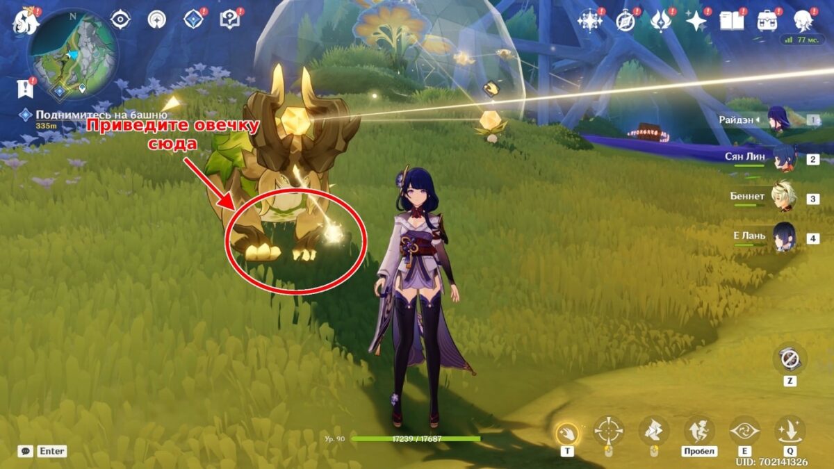 Последний узел — ленивая овечка, стоящая на краю ущелья. Притяните к себе энергетический поводок от её ядра и встаньте между цветком духов и сверкофруктом у обрыва. Постарайтесь отвести создание как можно дальше от источника куувяки в сторону купола, но следите, чтобы нить от сверкофрукта не оборвалась.