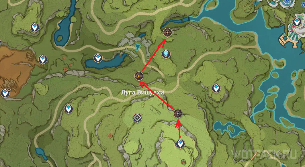 Всего в Сумеру и пустыне можно найти больше 30 драконов руин. На карте отмечены оба вида этих противников. Пять из них запечатаны в каменных колоннах и являются одноразовыми. В дальнейших пунктах рассмотрим только тех, что можно фармить на постоянной основе.