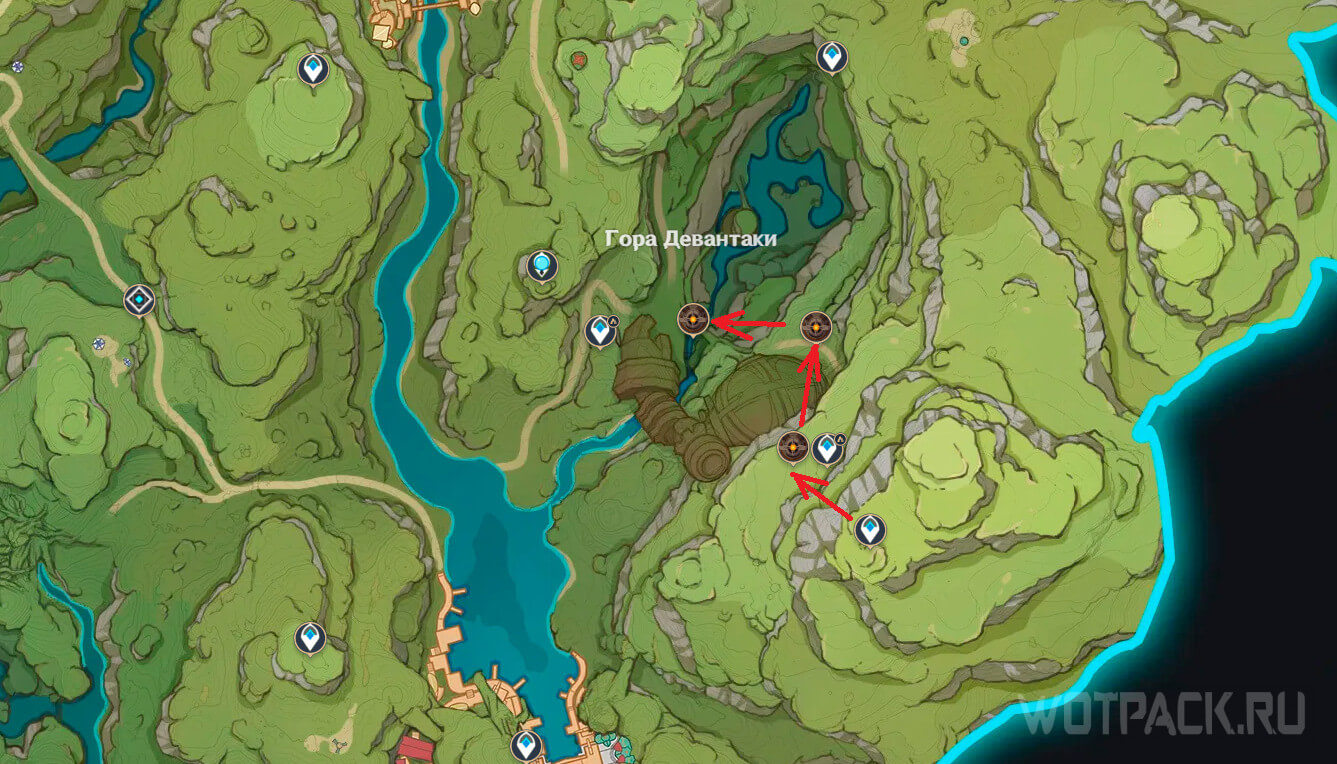 Первый маршрут в Долине Ардрави начинается с телепорта на восточной части Горы Девантаки. От него направляйтесь на склон пониже, на небольшом плато найдете Стража небес. После этого двигайтесь на северо-восток, у входа в пещеру расположен еще один такой же Дракон руин. От него идите в самый низ ущелья: у воды бродит Страж земли.