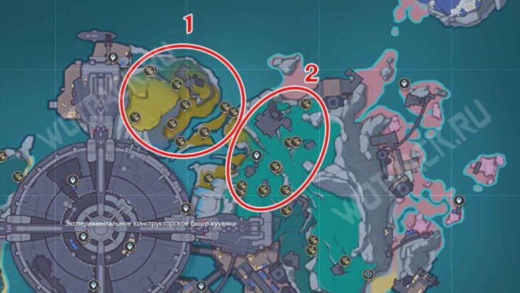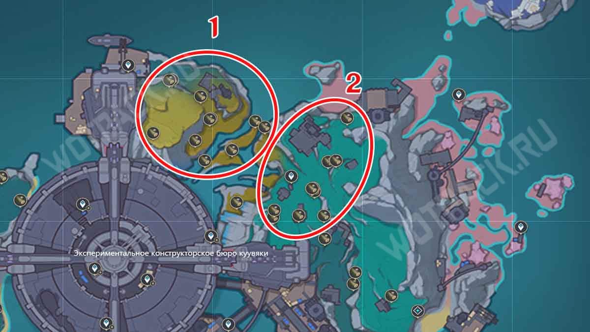 На северо-востоке бюро есть две наиболее комфортные точки. Лучше всего выбрать первую, находящуюся в желтой зоне, так в ней будет достаточно пробежаться от телепорта по островку в воде и вернуться. На зеленой части придется подниматься по небольшим холмам.
