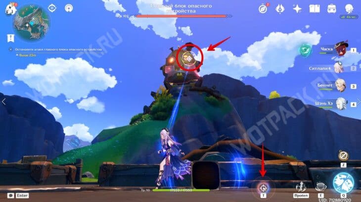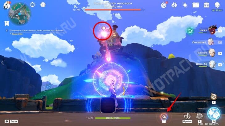 Внимательно наблюдайте за «головой» генератора и выжидайте. В нужный момент загорится клавиша «Т» и появится ядро, которое можно будет притянуть и отправить в противника. Продолжайте это до тех пор, пока полоска здоровья не истощится полностью.