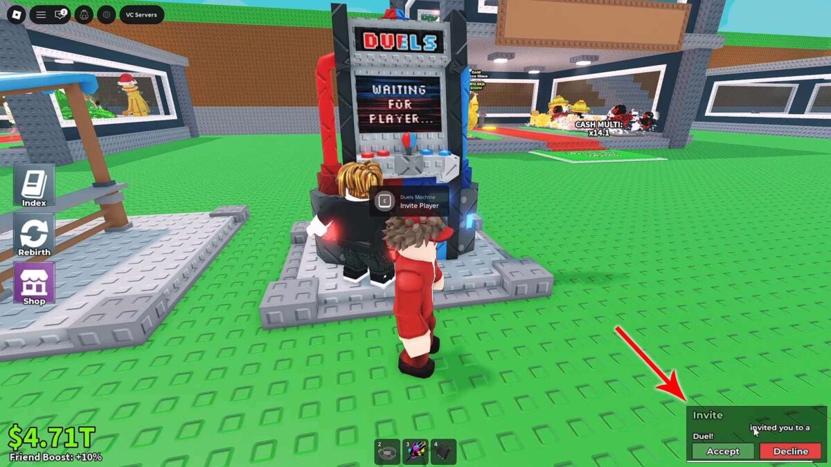 Предложить провести дуэль можно любому игроку на сервере и из списка друзей, а также найти оппонента по нику через глобальный поиск. Оба пользователя должны находиться в сети и принять приглашение. Подойдите к аркадному автомату справа от продавца экипировки и бросьте вызов.