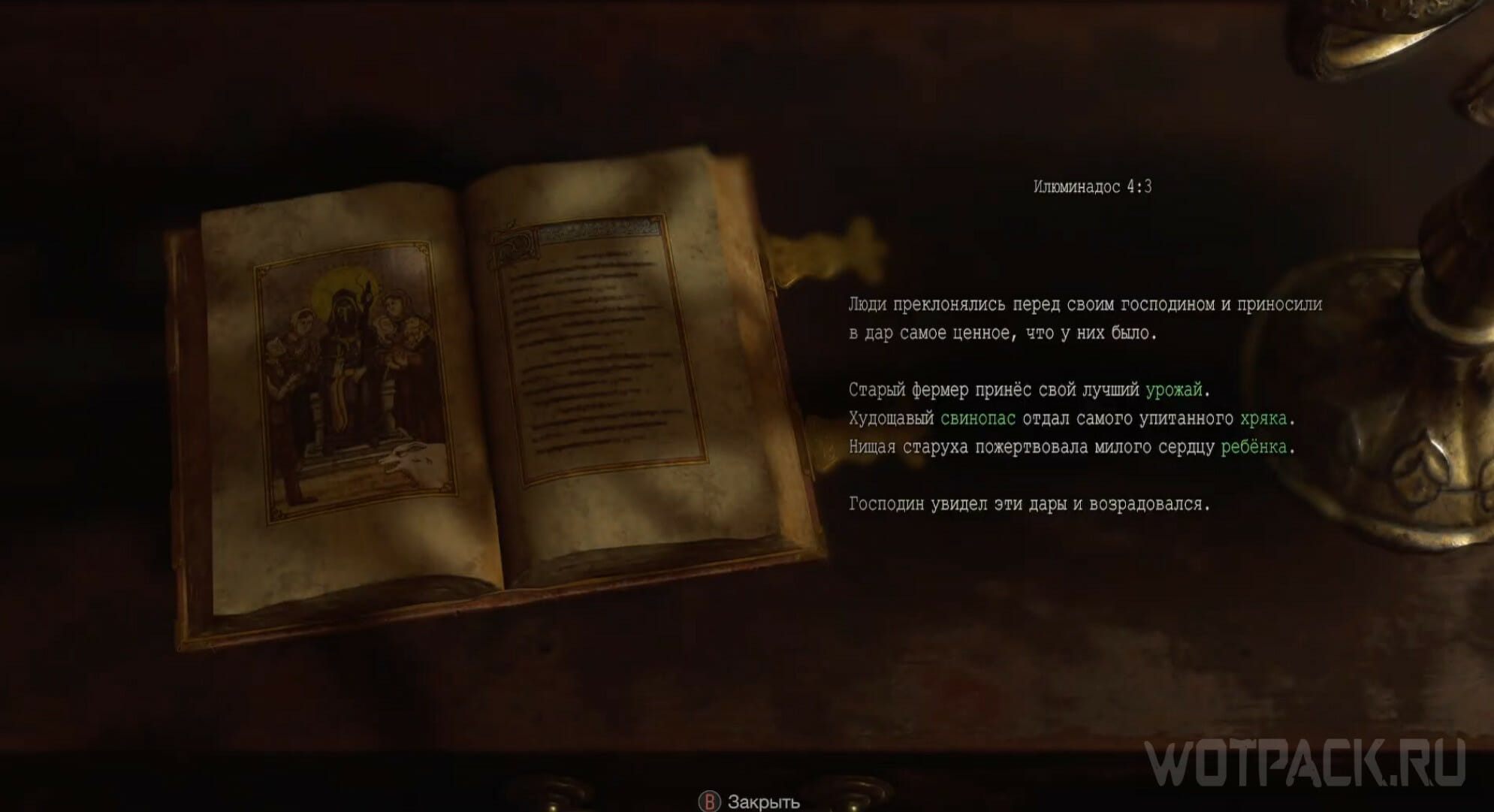 Вернитесь в прихожую и поднимитесь по лестнице на второй этаж. Пройдите направо по коридору и с левой стороны найдете небольшую тумбочку. На ней лежит книга, раскрытая на странице «Илюминадос 4:3».
